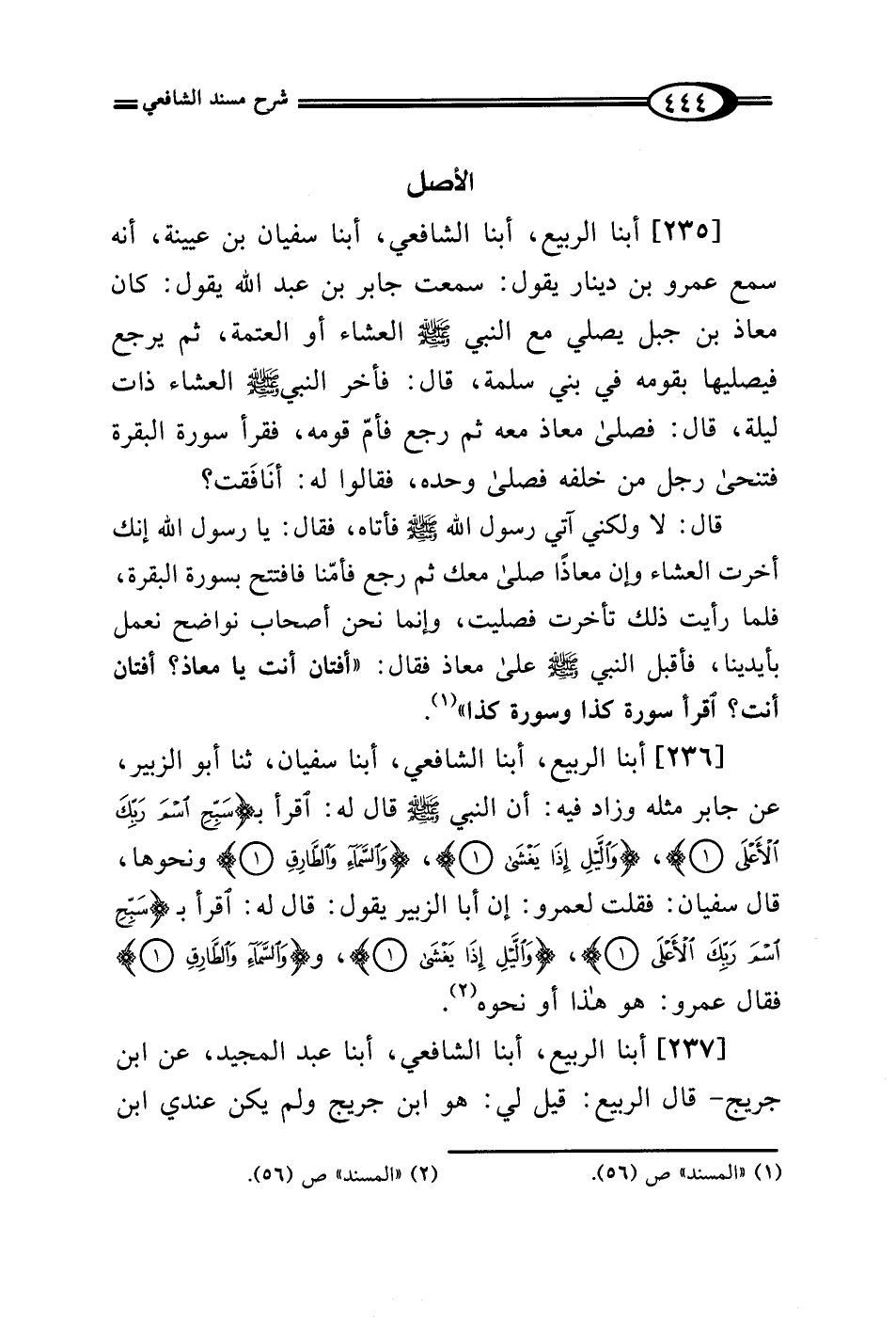 [235] أبنا الربيع، أبنا الشافعي، أبنا سفيان بن عيينة، أنه سمع عمرو بن دينار يقول: سمعت جابر بن عبد الله يقول: كان معاذ بن جبل يصلي مع النبي - صلى الله عليه وسلم - العشاء أو العتمة، ثم يرجع فيصليها بقومه في بني سلمة، قال: فأخر النبي صلى الله عليه وسلم العشاء ذات ليلة، قال: فصلى معاذ معه ثم رجع فأمّ قومه، فقرأ سورة البقرة فتنحى رجل من خلفه فصلى وحده، فقالوا له: أنَافَقت؟