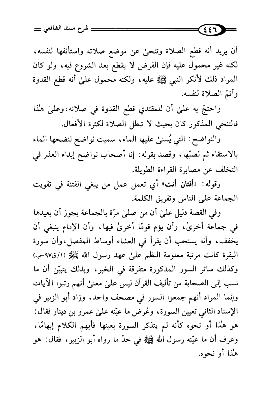 أن يريد أنه قطع الصلاة وتنحى عن موضع صلاته واستأنفها لنفسه، لكنه غير محمول عليه فإن الفرض لا يقطع بعد الشروع فيه، ولو كان المراد ذلك لأنكر النبي - صلى الله عليه وسلم -عليه، ولكنه محمول على أنه قطع القدوة وأتمّ الصلاة لنفسه.