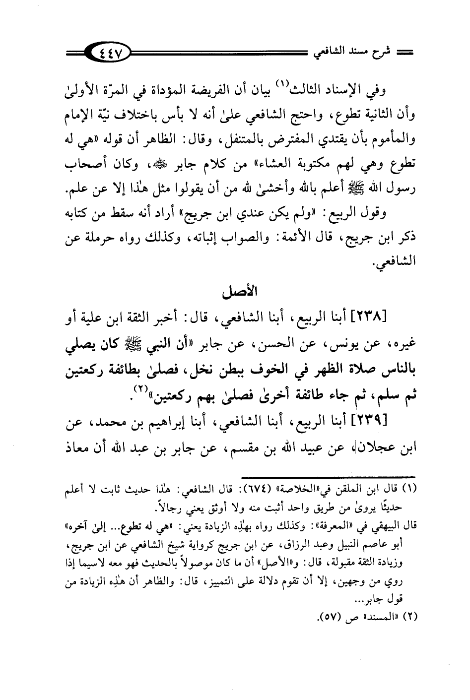 [238] أبنا الربيع، أبنا الشافعي، قال: أخبر الثقة ابن علية أو غيره، عن يونس، عن الحسن، عن جابر "أن النبي صلى الله عليه وسلم كان يصلي بالناس صلاة الظهر في الخوف ببطن نخل، فصلى بطائفة ركعتين ثم سلم، ثم جاء طائفة أخرج فصلى بهم ركعتين" (¬2).