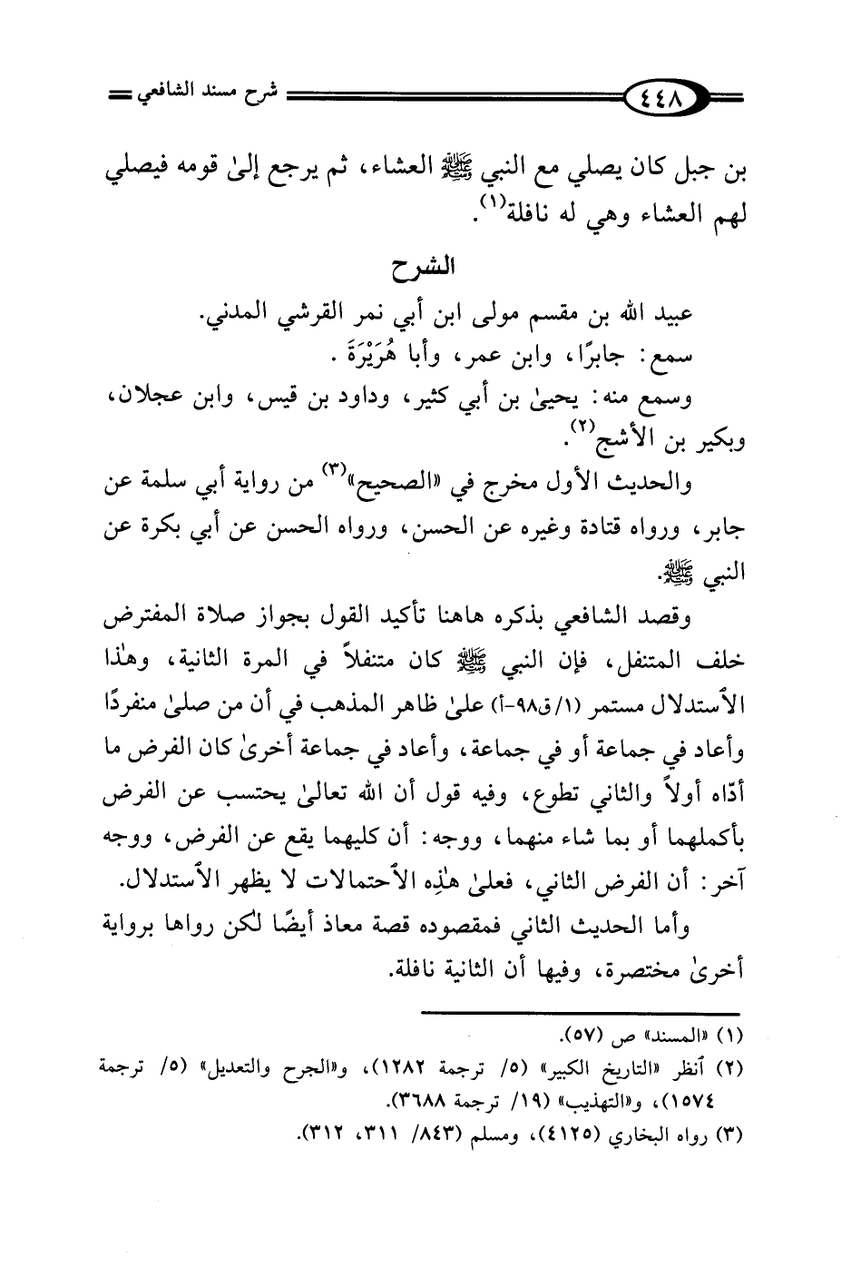وقصد الشافعي بذكره ها هنا تأكيد القول بجواز صلاة المفترض خلف المتنفل، فإن النبي صلى الله عليه وسلم كان متنفلًا في المرة الثانية، وهذا الاستدلال مستمر (1/ ق 98 - أ) على ظاهر المذهب في أن من صلى منفردًا وأعاد في جماعة أو في جماعة، وأعاد في جماعة أخرى كان الفرض ما أدّاه أولًا والثاني تطوع، وفيه قول أن الله تعالى يحتسب عن الفرض بأكملهما أو بما شاء منهما، ووجه: أن كليهما يقع عن الفرض، ووجه آخر: أن الفرض الثاني، فعلى هذِه الاحتمالات لا يظهر الاستدلال.