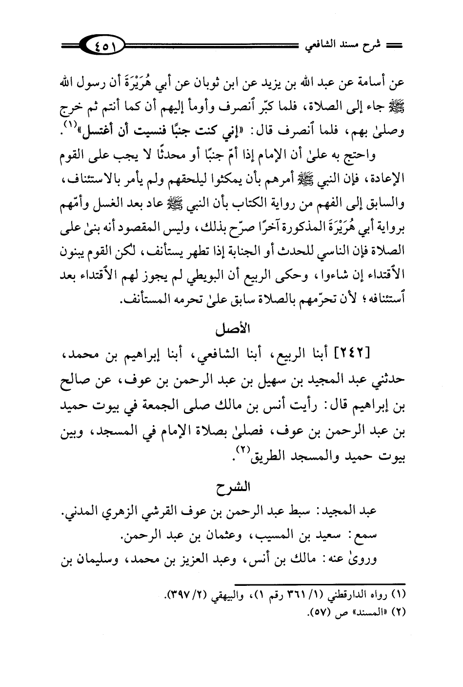 [242] أبنا الربيع، أبنا الشافعي، أبنا إبراهيم بن محمَّد، حدثني عبد المجيد بن سهيل بن عبد الرحمن بن عوف، عن صالح بن إبراهيم قال: رأيت أنس بن مالك صلى الجمعة في بيوت حميد بن عبد الرحمن بن عوف، فصلى بصلاة الإِمام في المسجد، وبين بيوت حميد والمسجد الطريق (¬2).