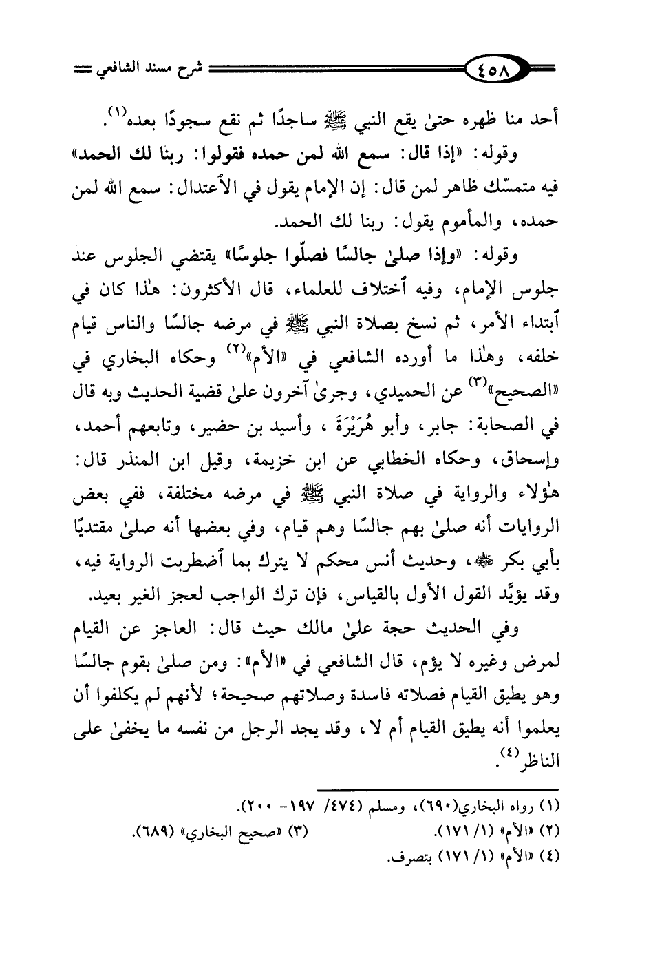 وقوله: "وإذا صلى جالسًا فصلّوا جلوسًا" يقتضي الجلوس عند جلوس الإِمام، وفيه اختلاف للعلماء، قال الأكثرون: هذا كان في ابتداء الأمر، ثم نسخ بصلاة النبي - صلى الله عليه وسلم - في مرضه جالسًا والناس قيام خلفه، وهذا ما أورده الشافعي في "الأم" (¬2) وحكاه البخاري في "الصحيح" (¬3) عن الحميدي، وجرى آخرون على قضية الحديث وبه قال في الصحابة: جابر، وأبو هُرَيْرَةَ، وأسيد بن حضير، وتابعهم أحمد، وإسحاق، وحكاه الخطابي عن ابن خزيمة، وقيل ابن المنذر قال: هؤلاء والرواية في صلاة النبي - صلى الله عليه وسلم - في مرضه مختلفة، ففي بعض الروايات أنه صلى بهم جالسًا وهم قيام، وفي بعضها أنه صلى مقتديًا بأبي بكر رضي الله عنه، وحديث أنس محكم لا يترك بما اضطربت الرواية فيه، وقد يؤيَّد القول الأول بالقياس، فإن ترك الواجب لعجز الغير بعيد.