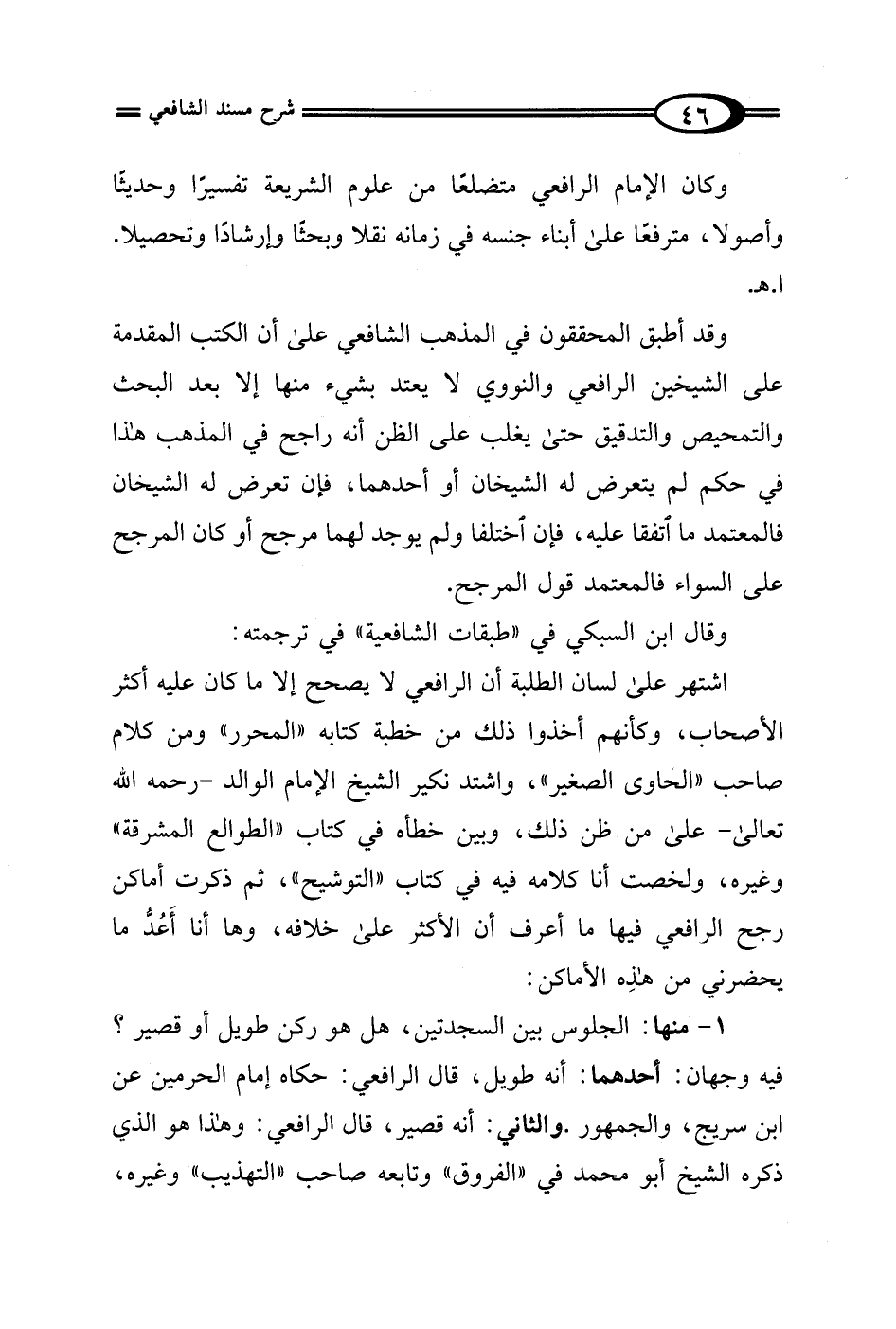 اشتهر على لسان الطلبة أن الرافعي لا يصحح إلا ما كان عليه أكثر الأصحاب، وكأنهم أخذوا ذلك من خطبة كتابه "المحرر" ومن كلام صاحب "الحاوى الصغير"، واشتد نكير الشيخ الإِمام الوالد - رحمه الله تعالى - على من ظن ذلك، وبين خطأه في كتاب "الطوالع المشرقة" وغيره، ولخصت أنا كلامه فيه في كتاب "التوشيح"، ثم ذكرت أماكن رجح الرافعي فيها ما أعرف أن الأكثر على خلافه، وها أنا أَعُدُّ ما يحضرني من هذِه الأماكن: