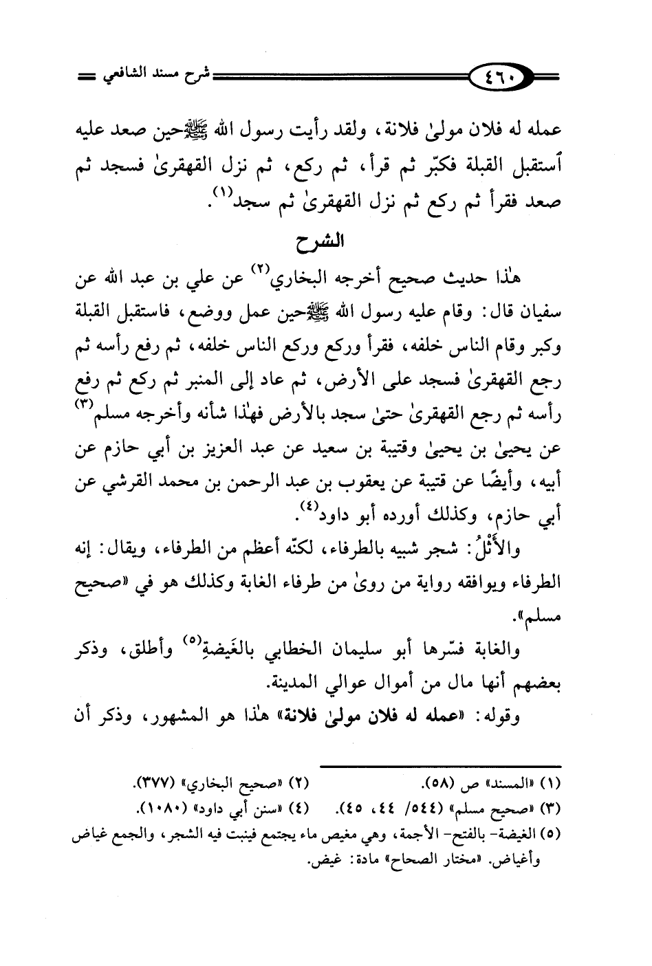 هذا حديث صحيح أخرجه البخاري (¬2) عن علي بن عبد الله عن سفيان قال: وقام عليه رسول الله - صلى الله عليه وسلم - حين عمل ووضع، فاستقبل القبلة وكبر وقام الناس خلفه، فقرأ وركع وركع الناس خلفه، ثم رفع رأسه ثم رجع القهقرى فسجد على الأرض، ثم عاد إلى المنبر ثم ركع ثم رفع رأسه ثم رجع القهقرى حتى سجد بالأرض فهذا شأنه وأخرجه مسلم (¬3) عن يحيى بن يحيى وقتيبة بن سعيد عن عبد العزيز بن أبي حازم عن أبيه، وأيضًا عن قتيبة عن يعقوب بن عبد الرحمن بن محمَّد القرشي عن أبي حازم، وكذلك أورده أبو داود (¬4).