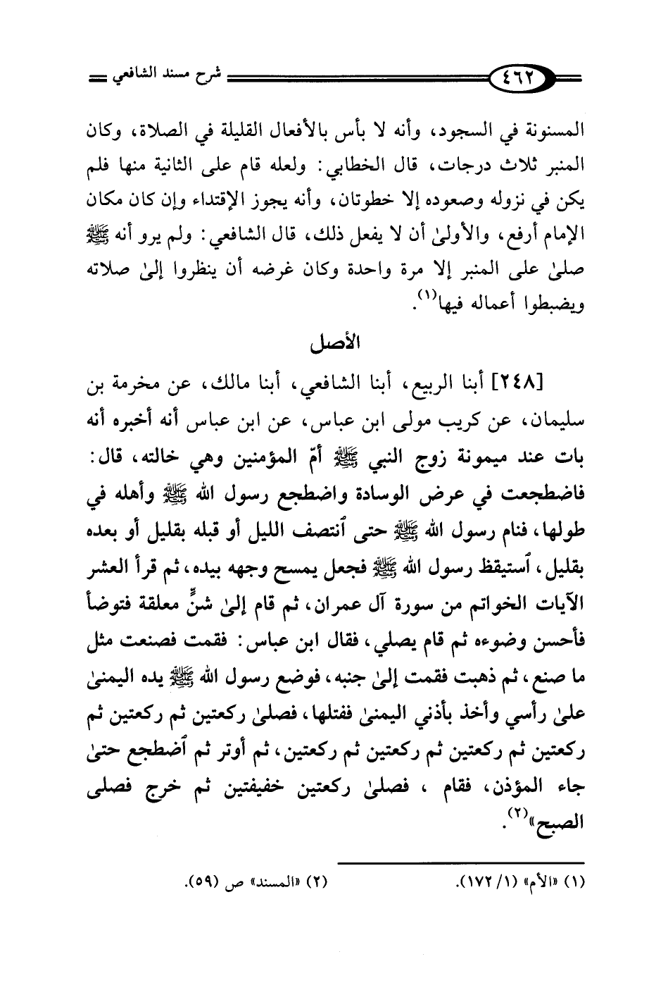 [248] أبنا الربيع، أبنا الشافعي، أبنا مالك، عن مخرمة بن سليمان، عن كريب مولى ابن عباس، عن ابن عباس أنه أخبره أنه بات عند ميمونة زوج النبي - صلى الله عليه وسلم - أمّ المؤمنين وهي خالته، قال: فاضطجعت في عرض الوسادة واضطجع رسول الله صلى الله عليه وسلم وأهله في طولها، فنام رسول الله صلى الله عليه وسلم حتى انتصف الليل أو قبله بقليل أو بعده بقليل، استيقظ رسول الله صلى الله عليه وسلم فجعل يمسح وجهه بيده، ثم قرأ العشر الآيات الخواتم من سورة آل عمران، ثم قام إلى شنٍّ معلقة فتوضأ فأحسن وضوءه ثم قام يصلي، فقال ابن عباس: فقمت فصنعت مثل ما صنع، ثم ذهبت فقمت إلى جنبه، فوضع رسول الله صلى الله عليه وسلم يده اليمنى على رأسي وأخذ بأذني اليمنى ففتلها، فصلى ركعتين ثم ركعتين ثم ركعتين ثم ركعتين ثم ركعتين ثم ركعتين، ثم أوتر ثم اضطجع حتى جاء المؤذن، فقام، فصلى ركعتين خفيفتين ثم خرج فصلى الصبح" (¬2).