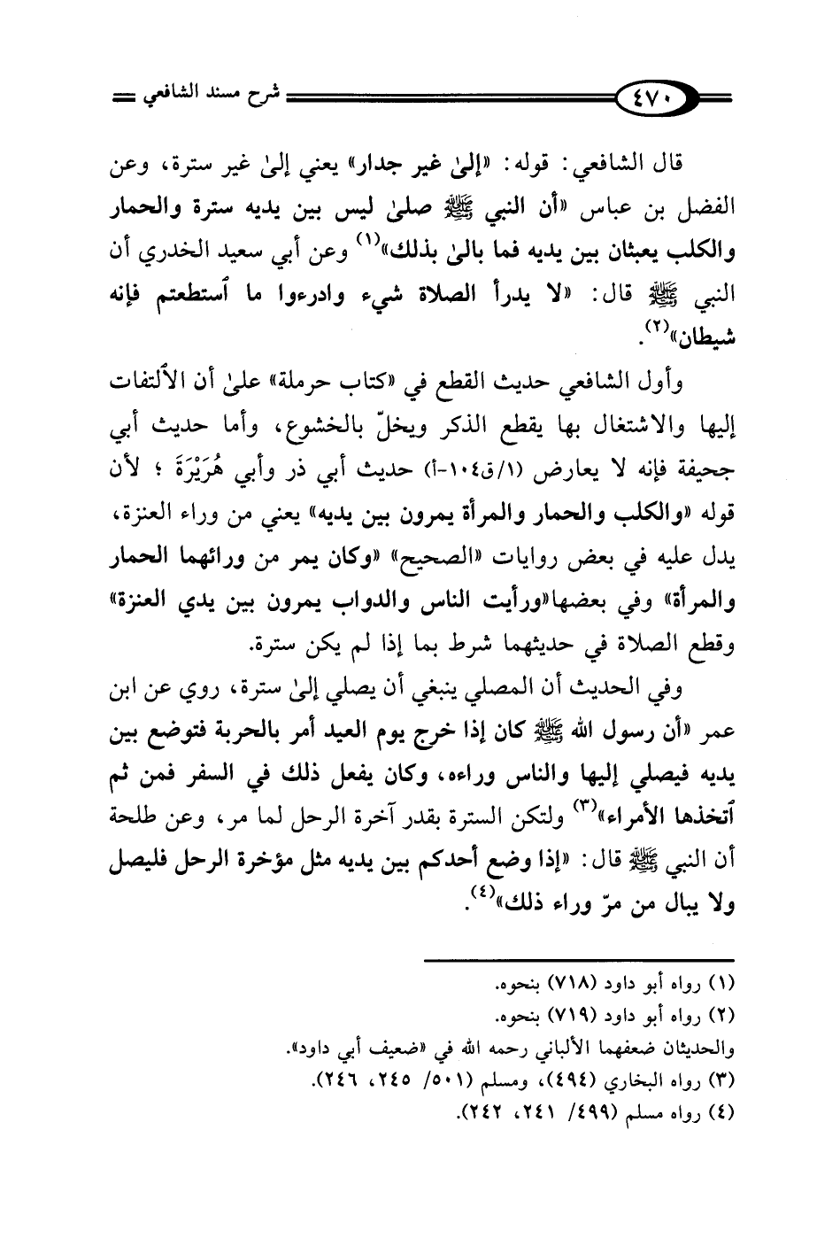 وأول الشافعي حديث القطع في "كتاب حرملة" على أن الالتفات إليها والاشتغال بها يقطع الذكر ويخلّ بالخشوع، وأما حديث أبي جحيفة فإنه لا يعارض حديث أبي ذر وأبي هُرَيْرَةَ؛ لأن قوله "والكلب والحمار والمرأة يمرون بين يديه" يعني من وراء العنزة، يدل عليه في بعض روايات "الصحيح" "وكان يمر من ورائهما الحمار والمرأة" وفي بعضها "ورأيت الناس والدواب يمرون بين يدي العنزة" وقطع الصلاة في حديثهما شرط بما إذا لم يكن سترة.