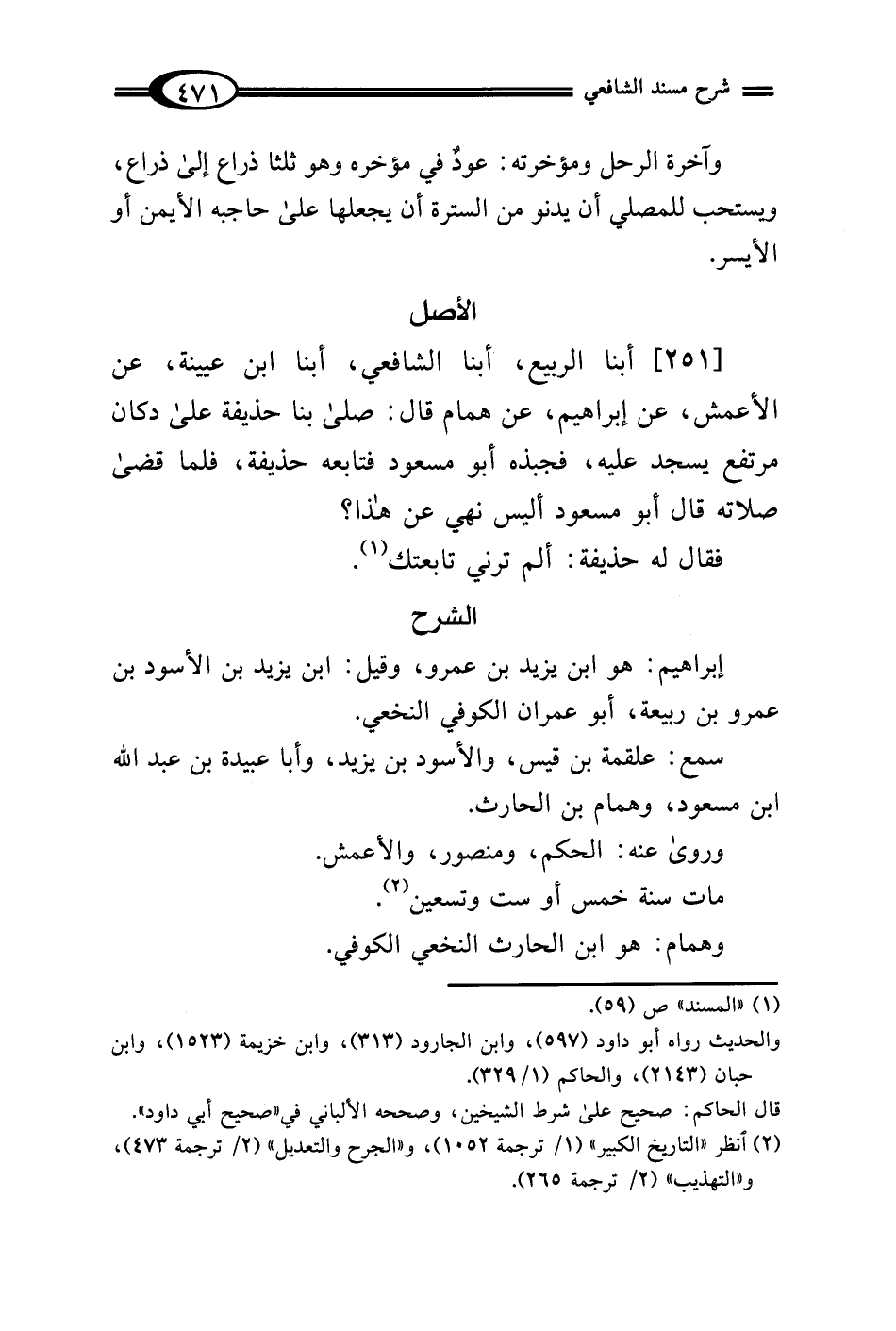 [251] أبنا الربيع، أبنا الشافعي، أبنا ابن عيينة، عن الأعمش، عن إبراهيم، عن همام قال: صلى بنا حذيفة على دكان مرتفع يسجد عليه، فجبذه أبو مسعود فتابعه حذيفة، فلما قضى صلاته قال أبو مسعود أليس نهي عن هذا؟