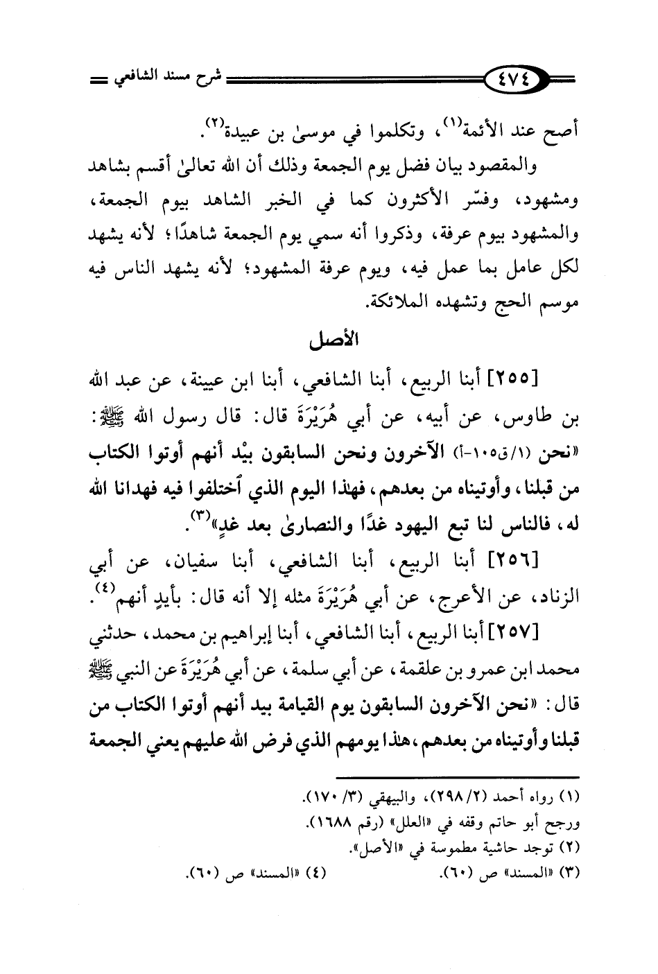 [257] أبنا الربيع، أبنا الشافعي، أبنا إبراهيم بن محمَّد، حدثني محمَّد ابن عمرو بن علقمة، عن أبي سلمة، عن أبي هُرَيْرَةَ عن النبي - صلى الله عليه وسلم - قال: "نحن الآخرون السابقون يوم القيامة بيد أنهم أوتوا الكتاب من قبلنا وأوتيناه من بعدهم، هذا يومهم الذي فرض الله عليهم يعني الجمعة
