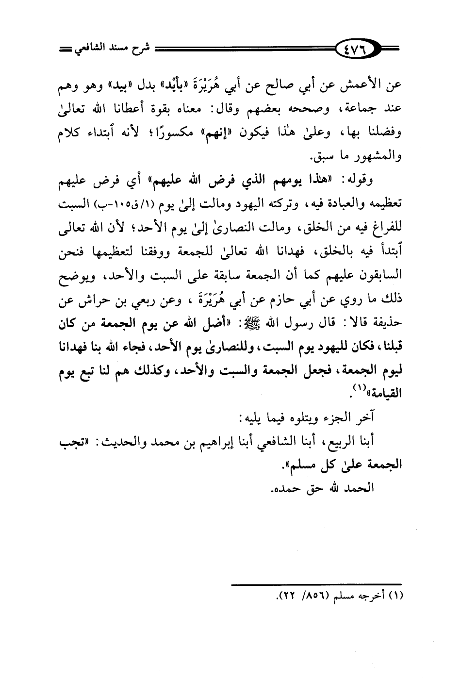 أبنا الربيع، أبنا الشافعي أبنا إبراهيم بن محمَّد والحديث: "تجب الجمعة على كل مسلم".