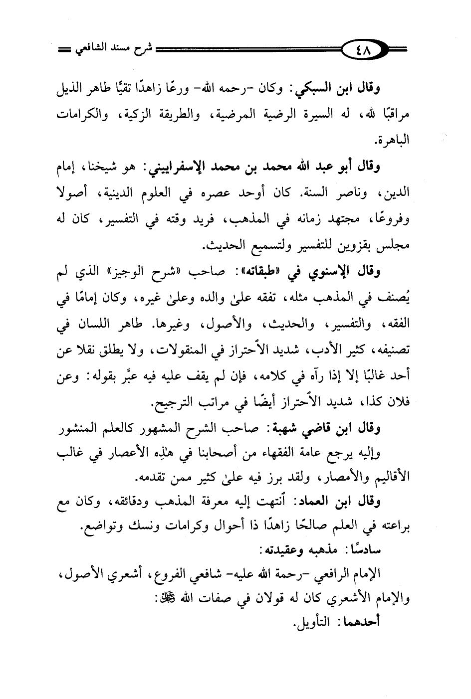 وقال الإسنوي في "طبقاته": صاحب "شرح الوجيز" الذي لم يُصنف في المذهب مثله، تفقه على والده وعلى غيره، وكان إمامًا في الفقه، والتفسير، والحديث، والأصول، وغيرها. طاهر اللسان في تصنيفه، كثير الأدب، شديد الاحتراز في المنقولات، ولا يطلق نقلا عن أحد غالبًا إلا إذا رآه في كلامه، فإن لم يقف عليه فيه عبَّر بقوله: وعن فلان كذا، شديد الاحتراز أيضًا في مراتب الترجيح.