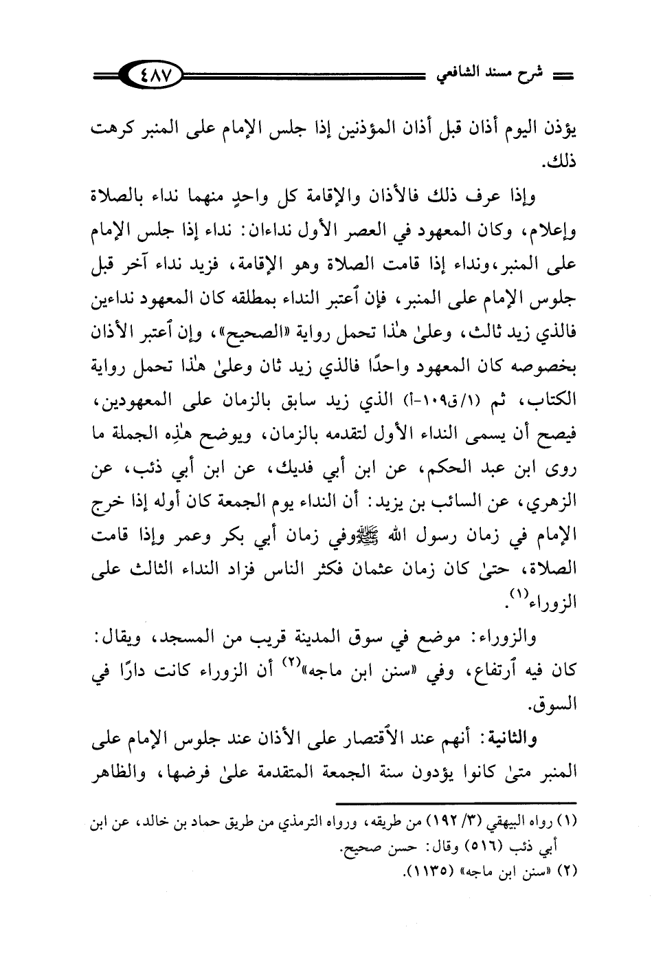 وإذا عرف ذلك فالأذان والإقامة كل واحدٍ منهما نداء بالصلاة وإعلام، وكان المعهود في العصر الأول نداءان: نداء إذا جلس الإِمام على المنبر، ونداء إذا قامت الصلاة وهو الإقامة، فزيد نداء آخر قبل جلوس الإِمام على المنبر، فإن اعتبر النداء بمطلقه كان المعهود نداءين فالذي زيد ثالث، وعلى هذا تحمل رواية "الصحيح"، وإن اعتبر الأذان بخصوصه كان المعهود واحدًا فالذي زيد ثان وعلى هذا تحمل رواية الكتاب، ثم الذي زيد سابق بالزمان على المعهودين، فيصح أن يسمى النداء الأول لتقدمه بالزمان، ويوضح هذه الجملة ما روى ابن عبد الحكم، عن ابن أبي فديك، عن ابن أبي ذئب، عن الزهري، عن السائب بن يزيد: أن النداء يوم الجمعة كان أوله إذا خرج الإِمام في زمان رسول الله صلى الله عليه وسلم وفي زمان أبي بكر وعمر وإذا قامت الصلاة، حتى كان زمان عثمان فأكثر الناس فزاد النداء الثالث على الزوراء (¬1).