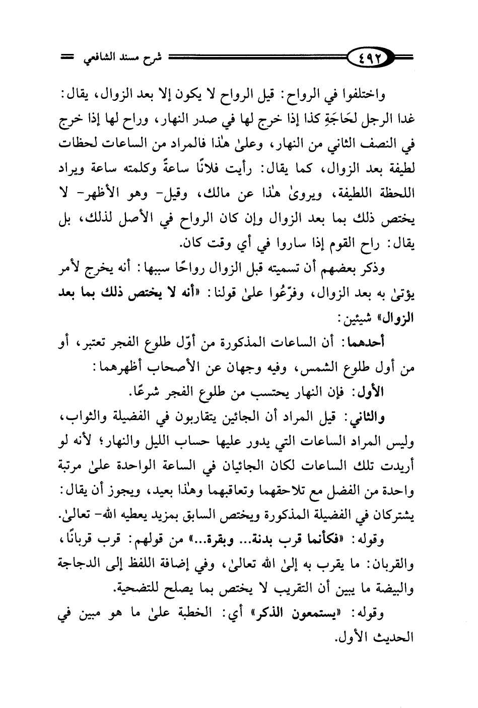 واختلفوا في الرواح: قيل الرواح لا يكون إلا بعد الزوال، يقال: غدا الرجل لحَاجَةِ كذا إذا خرج لها في صدر النهار، وراح لها إذا خرج في النصف الثاني من النهار، وعلى هذا فالمراد من الساعات لحظات لطيفة بعد الزوال، كما يقال: رأيت فلانًا ساعةً وكلمته ساعة ويراد اللحظة اللطيفة، ويروى هذا عن مالك، وقيل -وهو الأظهر- لا يختص ذلك بما بعد الزوال وإن كان الرواح في الأصل لذلك، بل يقال: راح القوم إذا ساروا في أي وقت كان.