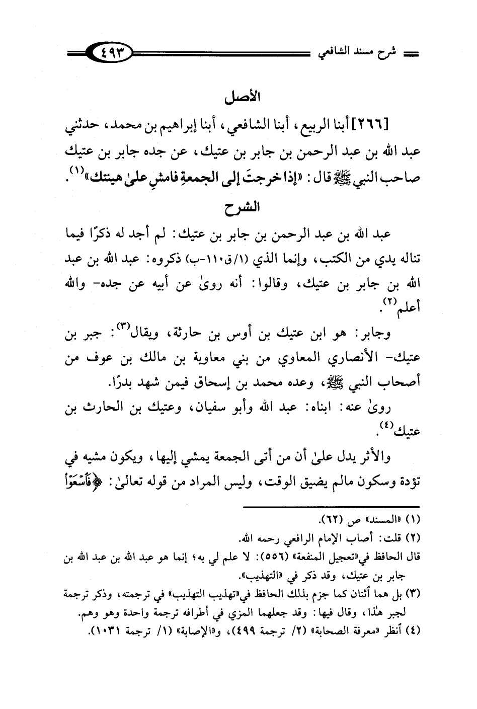 [266] أبنا الربيع، أبنا الشافعي، أبنا إبراهيم بن محمَّد، حدثني عبد الله بن عبد الرحمن بن جابر بن عتيك، عن جده جابر بن عتيك صاحب النبي - صلى الله عليه وسلم - قال: "إذا خرجتَ إلى الجمعةِ فامشِ على هينتك" (¬1).
