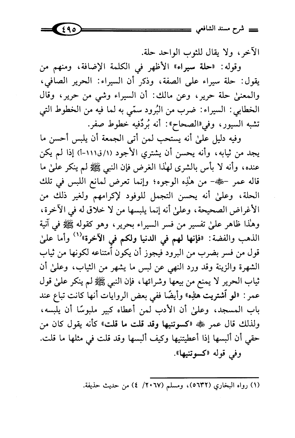 وقوله: "حلة سيراء" الأظهر في الكلمة الإضافة، ومنهم من يقول: حلة سيراء على الصفة، وذكر أن السيراء: الحرير الصافي، والمعنى حلة حرير، وعن مالك: أن السيراء وشي من حرير، وقال الخطابي: السيراء: ضرب من البُرود سمّي به لما فيه من الخطوط التي تشبه السيور، وفي "الصحاح": أنه بُردٌ فيه خطوط صفر.