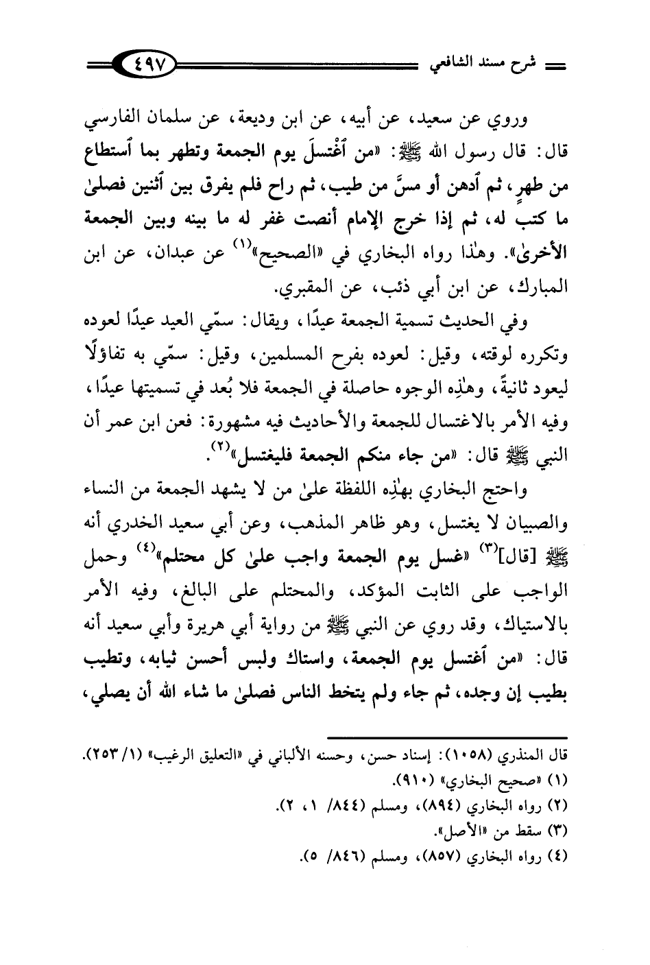 وفي الحديث تسمية الجمعة عيدًا، ويقال: سمّي العيد عيدًا لعوده وتكرره لوقته، وقيل: لعوده بفرح المسلمين، وقيل: سمّي به تفاؤلًا ليعود ثانيةً، وهذِه الوجوه حاصلة في الجمعة فلا بُعد في تسميتها عيدًا، وفيه الأمر بالاغتسال للجمعة والأحاديث فيه مشهورة: فعن ابن عمر أن النبي صلى الله عليه وسلم قال: "من جاء منكم الجمعة فليغتسل" (¬2).