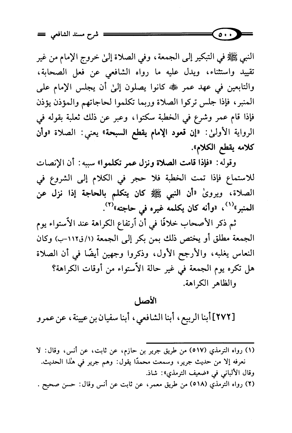 النبي - صلى الله عليه وسلم - في التبكير إلى الجمعة، وفي الصلاة إلى خروج الإِمام من غير تقييد واستثناء، ويدل عليه ما رواه الشافعي عن فعل الصحابة، والتابعين في عهد عمر -رضي الله عنه- كانوا يصلون إلى أن يجلس الإِمام على المنبر، فإذا جلس تركوا الصلاة وربما تكلموا لحاجاتهم والمؤذن يؤذن فإذا قام عمر وشرع في الخطبة سكتوا، وعبر عن ذلك ثعلبة بقوله في الرواية الأولى: "إن قعود الإِمام يقطع السبحة" يعني: الصلاة "وأن كلامه يقطع الكلام".