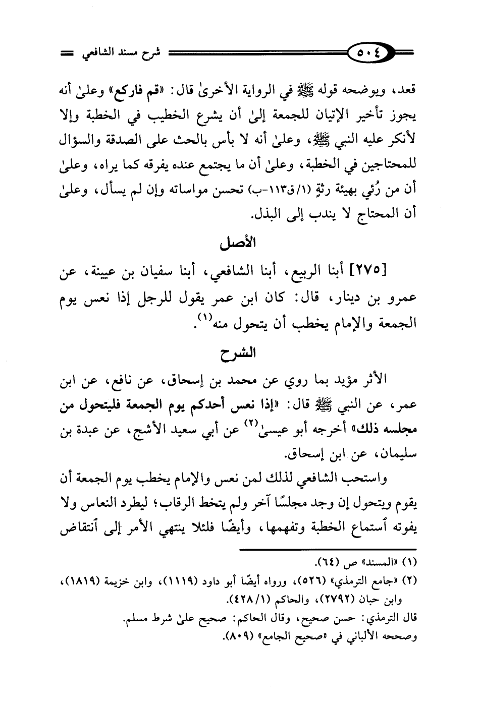 [275] أبنا الربيع، أبنا الشافعي، أبنا سفيان بن عيينة، عن عمرو بن دينار، قال: كان ابن عمر يقول للرجل إذا نعس يوم الجمعة والإمام يخطب أن يتحول منه (¬1).