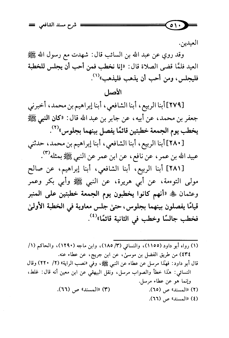 [279] أبنا الربيع، أبنا الشافعي، أبنا إبراهيم بن محمَّد، أخبرني جعفر بن محمَّد، عن أبيه، عن جابر بن عبد الله قال: "كان النبي - صلى الله عليه وسلم - يخطب يوم الجمعة خطبتين قائمًا يفصل بينهما بجلوس" (¬2).