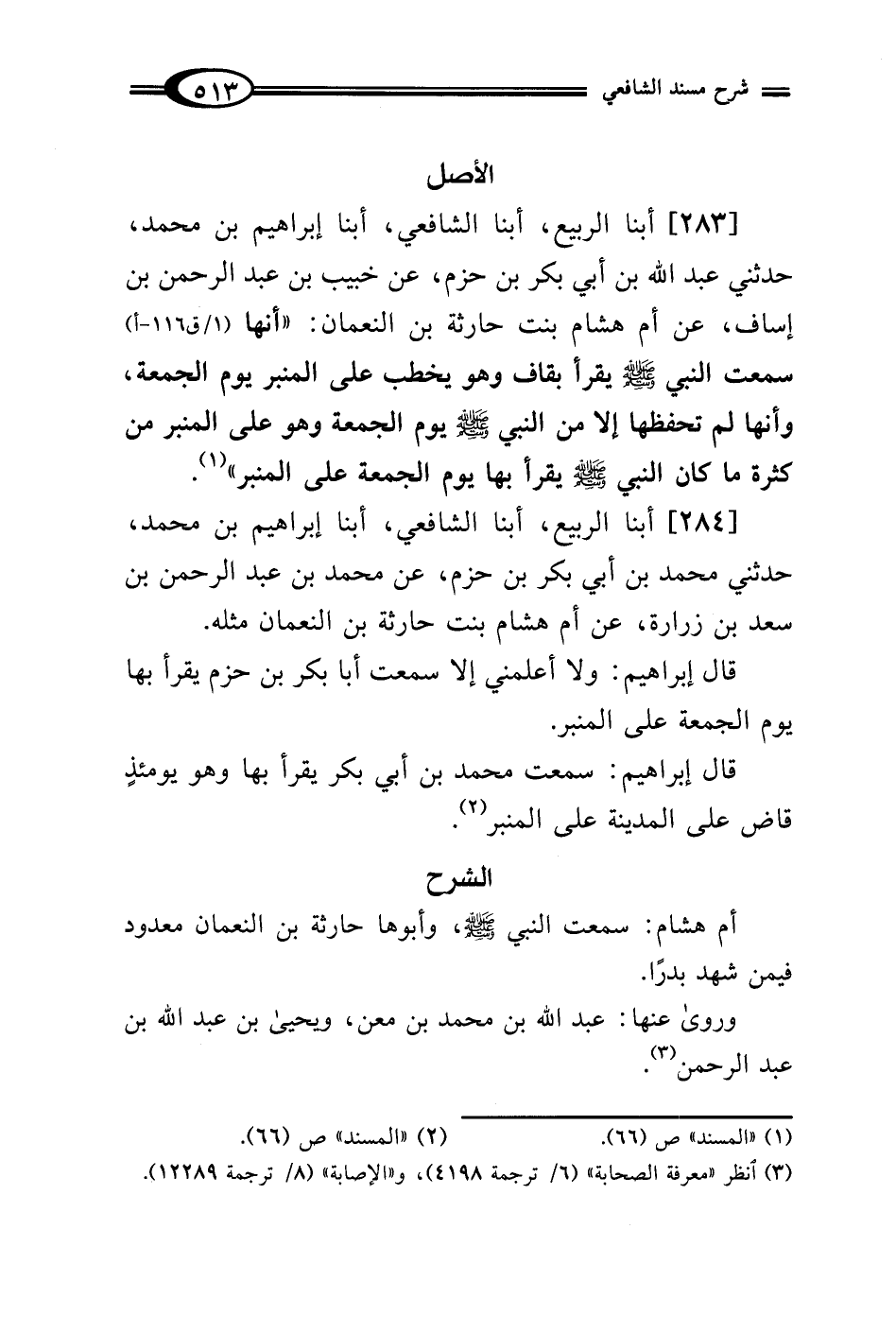 [283] أبنا الربيع، أبنا الشافعي، أبنا إبراهيم بن محمَّد، حدثني عبد الله بن أبي بكر بن حزم، عن خبيب بن عبد الرحمن بن إساف، عن أم هشام بنت حارثة بن النعمان: "أنها سمعت النبي - صلى الله عليه وسلم - يقرأ بقاف وهو يخطب على المنبر يوم الجمعة، وأنها لم تحفظها إلا من النبي - صلى الله عليه وسلم - يوم الجمعة وهو على المنبر من كثرة ما كان النبي - صلى الله عليه وسلم - يقرأ بها يوم الجمعة على المنبر" (¬1).