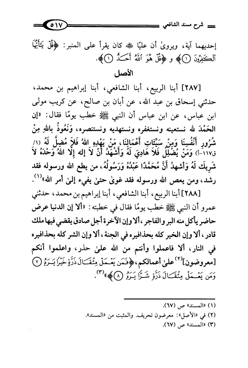 [287] أبنا الربيع، أبنا الشافعي، أبنا إبراهيم بن محمَّد، حدثني إسحاق بن عبد الله، عن أبان بن صالح، عن كريب مولى ابن عباس، عن ابن عباس أن النبي صلى الله عليه وسلم خطب يومًا فقال: "إن الحَمْدَ لله نستعينه ونستغفره ونستهديه ونستنصره، وَنَعُوذُ باللهِ مِنْ شُرُورِ أَنْفُسِنَا وَمِنْ سَيِّئَاتِ أَعْمَالِنَا، مَنْ يَهْدِهِ اللهُ فَلاَ مُضِلَّ لَهُ وَمَنْ يُضْلِلْ فَلاَ هَادِيَ لَهُ وَأَشْهَدُ أنْ لاَ إلَه إِلّا اللهُ وَحْدَهُ لاَ شَرِيكَ لَهُ وَأشهدُ أَنَّ مُحَمَّدًا عَبْدُهُ وَرَسُولُهُ، من يطع الله ورسوله فقد رشد، ومن يعص الله ورسوله فقد غوى حتى يفيء إلى أمر الله" (¬1).