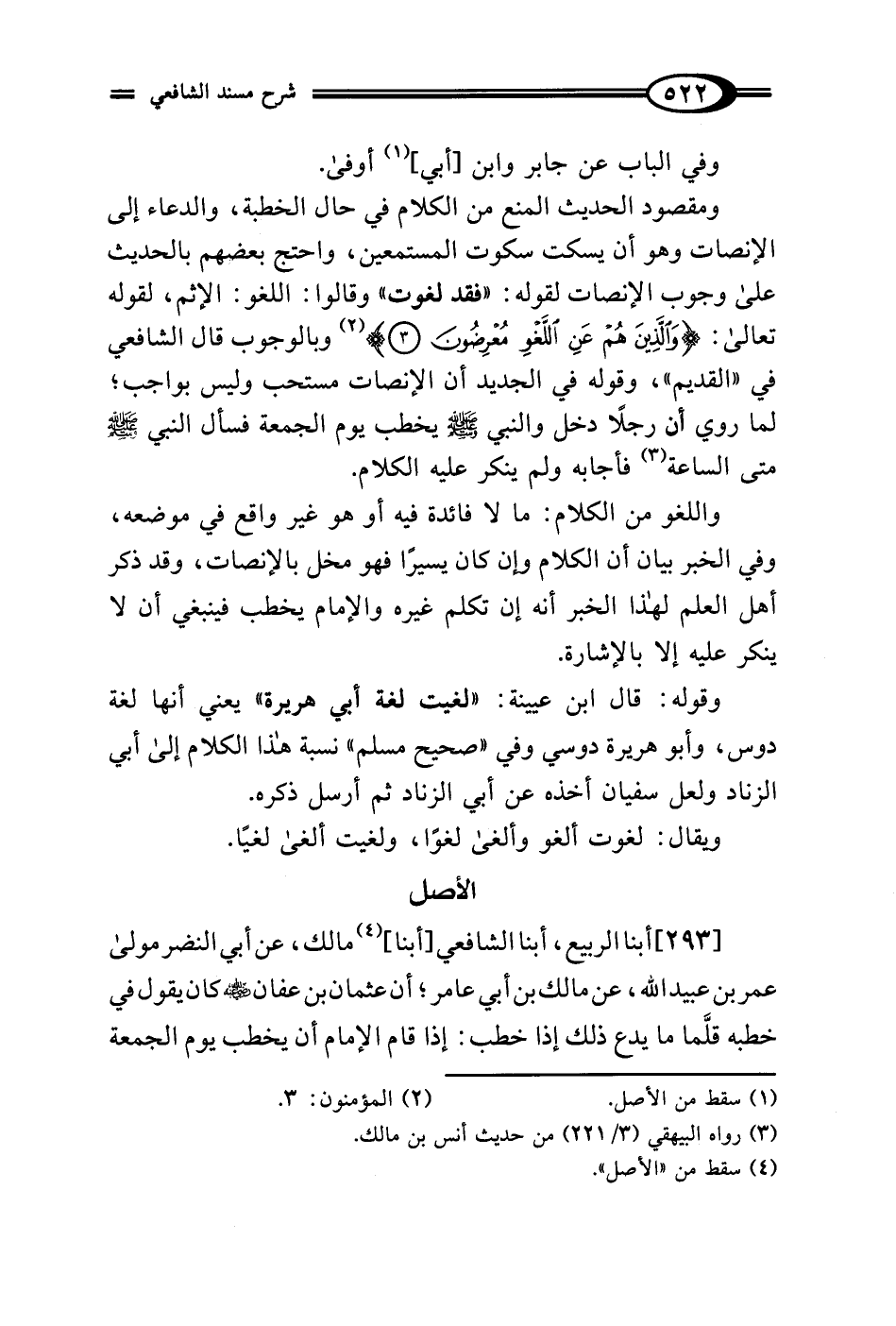 [293] أبنا الربيع، أبنا الشافعي [أبنا] (¬4) مالك، عن أبي النضر مولى عمر بن عبيد الله، عن مالك بن أبي عامر؛ أن عثمان بن عفان -رضي الله عنه- كان يقول في خطبه قلَّما ما يدع ذلك إذا خطب: إذا قام الإِمام أن يخطب يوم الجمعة