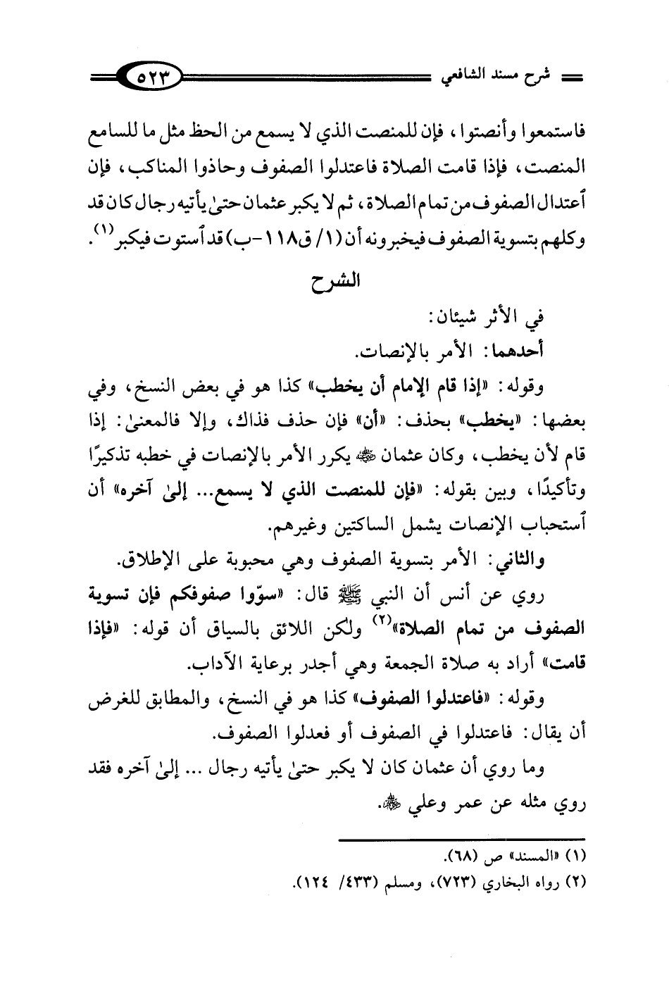 فاستمعوا وأنصتوا، فإن للمنصت الذي لا يسمع من الحظ مثل ما للسامع المنصت، فإذا قامت الصلاة فاعتدلوا الصفوف وحاذوا المناكب، فإن اعتدال الصفوف من تمام الصلاة، ثم لا يكبر عثمان حتى يأتيه رجال كان قد وكلهم بتسوية الصفوف فيخبرونه أن قد استوت فيكبر (¬1).