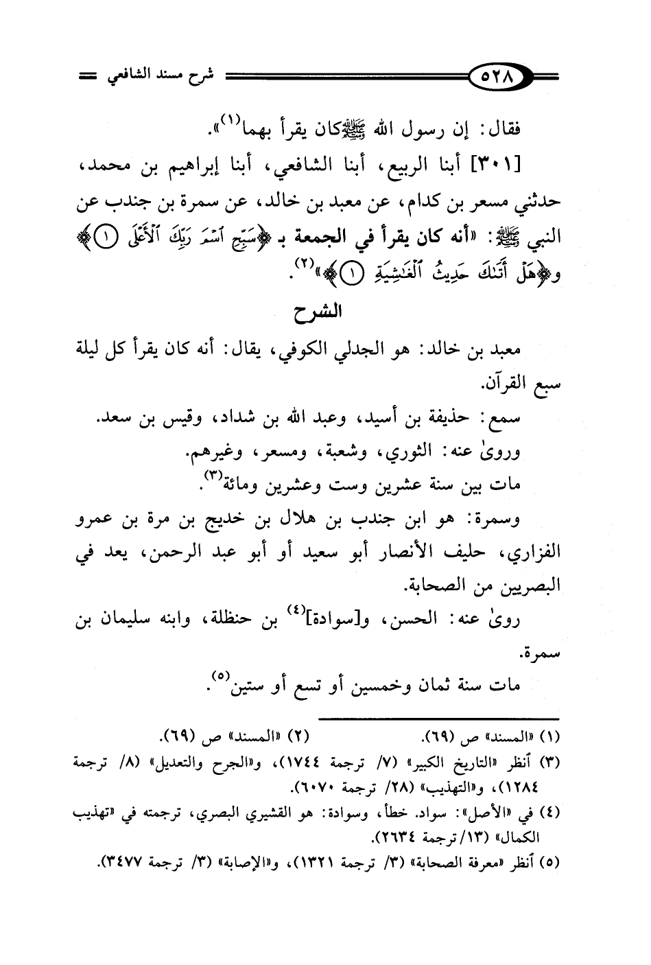 [301] أبنا الربيع، أبنا الشافعي، أبنا إبراهيم بن محمَّد، حدثني مسعر بن كدام، عن معبد بن خالد، عن سمرة بن جندب عن النبي صلى الله عليه وسلم: "أنه كان يقرأ في الجمعة بـ {سَبِّحِ اسْمَ رَبِّكَ الْأَعْلَى} و {هَلْ أَتَاكَ حَدِيثُ الْغَاشِيَةِ} (¬2).
