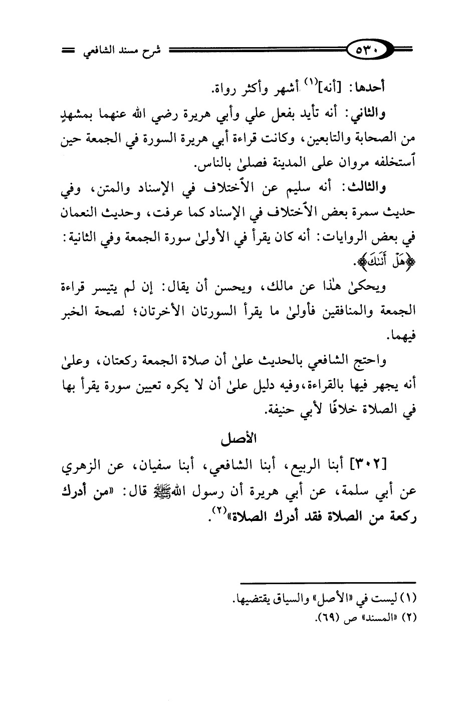 [302] أبنا الربيع، أبنا الشافعي، أبنا سفيان، عن الزهري عن أبي سلمة، عن أبي هريرة أن رسول الله - صلى الله عليه وسلم - قال: "من أدرك ركعة من الصلاة فقد أدرك الصلاة" (¬2).