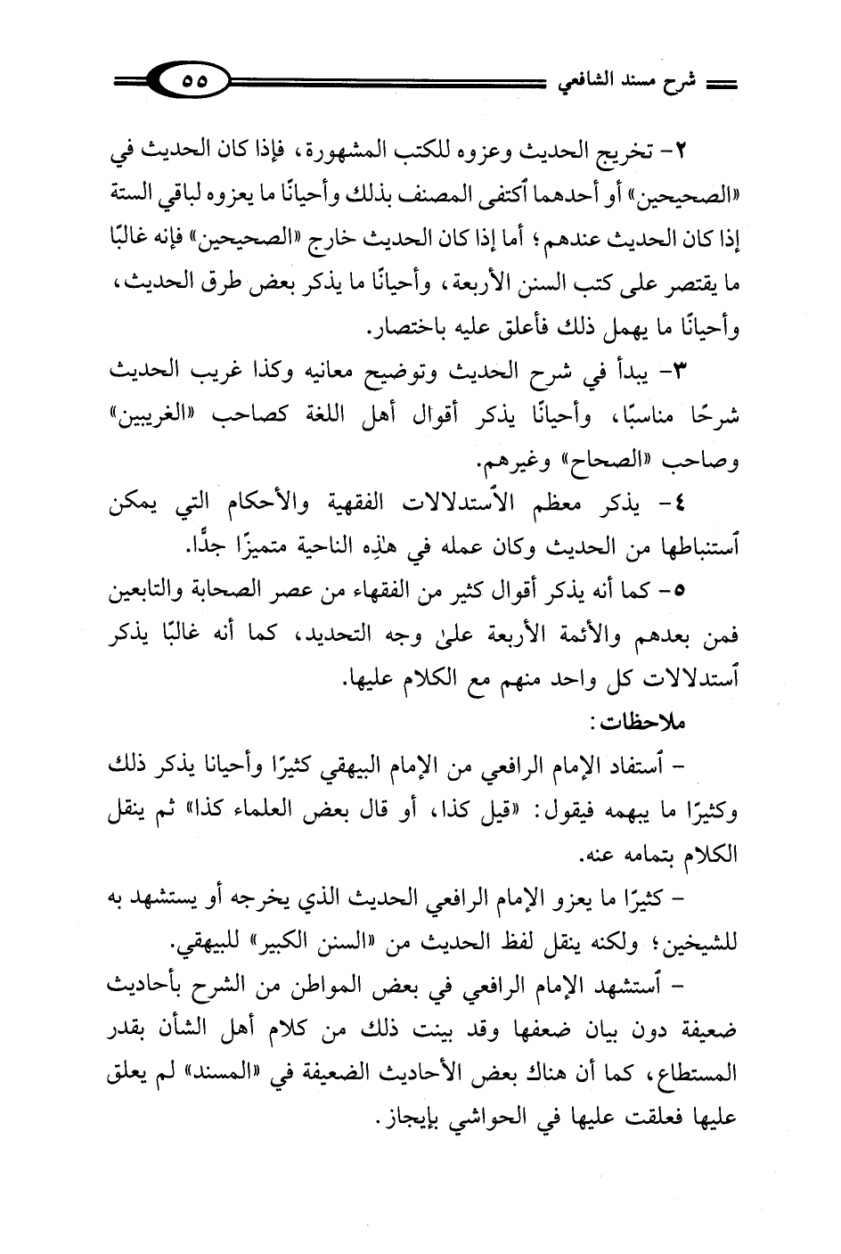 - استشهد الإِمام الرافعي في بعض المواطن من الشرح بأحاديث ضعيفة دون بيان ضعفها وقد بينت ذلك من كلام أهل الشأن بقدر المستطاع، كما أن هناك بعض الأحاديث الضعيفة في "المسند" لم يعلق عليها فعلقت عليها في الحواشي بإيجاز.