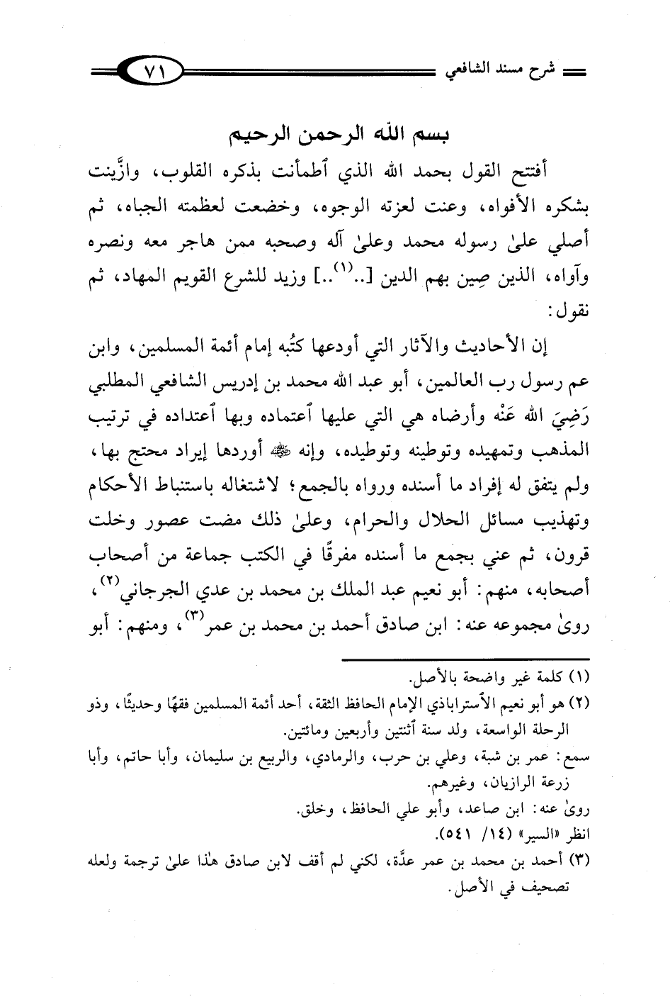 إن الأحاديث والآثار التي أودعها كتُبه إمام أئمة المسلمين، وابن عم رسول رب العالمين، أبو عبد الله مُحَمَّد بن إدريس الشافعي المطلبي رَضِيَ الله عَنْهُ وأرضاه هي التي عليها اعتماده وبها اعتداده في ترتيب المذهب وتمهيده وتوطينه وتوطيده، وإنه -رَضِيَ الله عَنْهُ- أوردها إيراد محتج بها، ولم يتفق له إفراد ما أسنده ورواه بالجمع؛ لاشتغاله باستنباط الأحكام وتهذيب مسائل الحلال والحرام، وعلى ذلك مضت عصور وخلت قرون، ثم عني بجمع ما أسنده مفرقًا في الكتب جماعة من أصحاب أصحابه، منهم: أبو نعيم عبد الملك بن مُحَمَّد بن عدي الجرجاني (¬2)، روى مجموعه عنه: ابن صادق أحمد بن مُحَمَّد بن عمر (¬3)، ومنهم: أبو