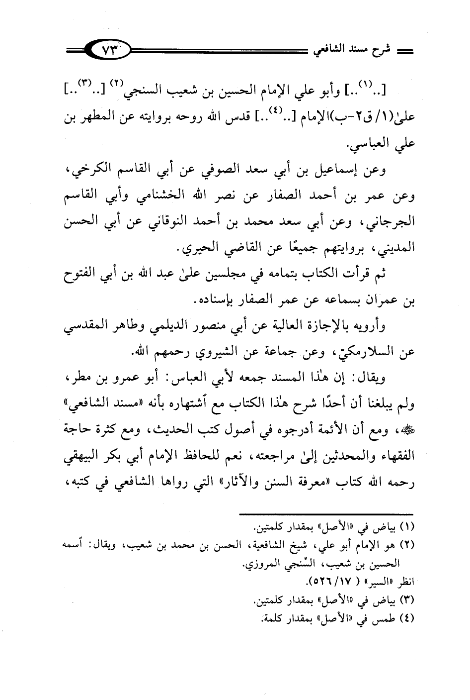 [.. (¬1) ..] وأبو علي الإِمام الحسين بن شعيب السنجي (¬2) [.. (¬3) ..] على (1/ ق 2 - ب) (الإِمام [.. (¬4) ..] قدس الله روحه بروايته عن المطهر بن علي العباسي.