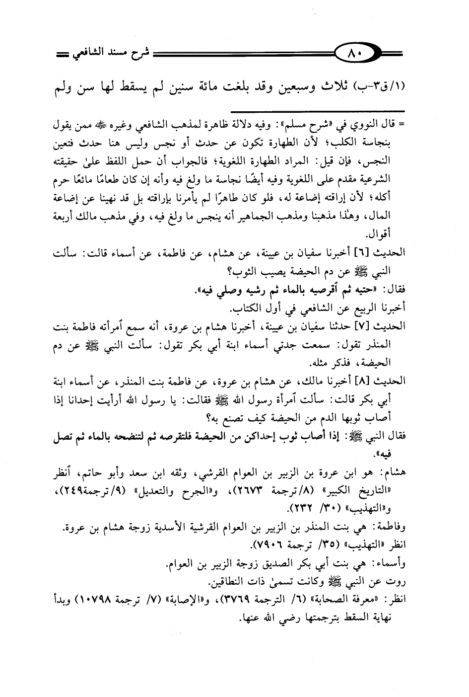 الحديث [7] حدثنا سفيان بن عيينة، أخبرنا هشام بن عروة، أنه سمع امرأته فاطمة بنت المنذر تقول: سمعت جدتي أسماء ابنة أبي بكر تقول: سألت النبي - صلى الله عليه وسلم - عن دم الحيضة، فذكر مثله.