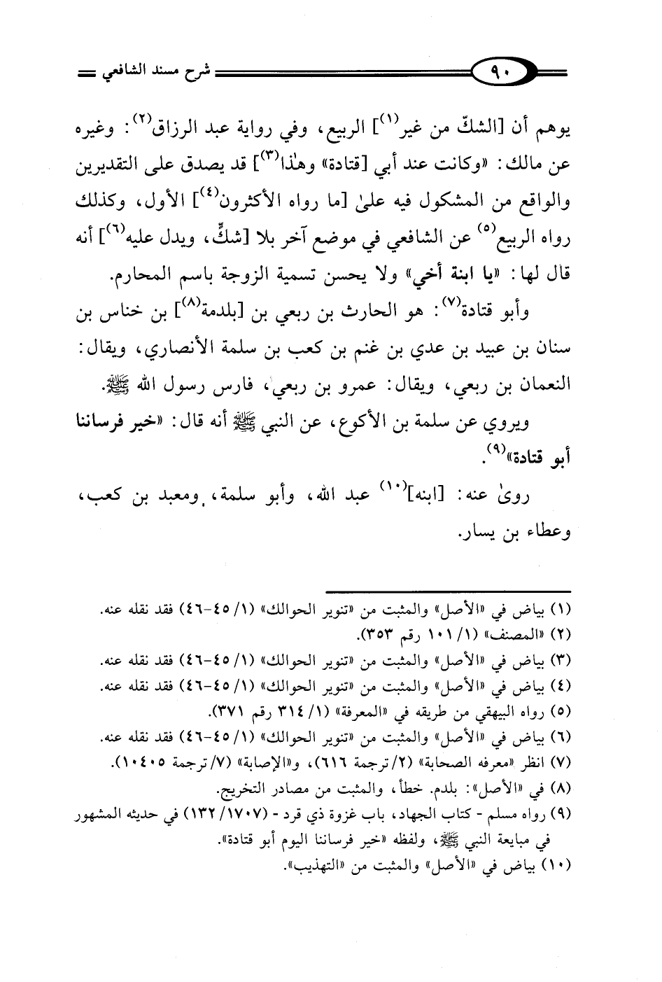 (¬9) رواه مسلم - كتاب الجهاد، باب غزوة ذي قرد - (1707/ 132) في حديثه المشهور في مبايعة النبي - صلى الله عليه وسلم -، ولفظه "خير فرساننا اليوم أبو قتادة".