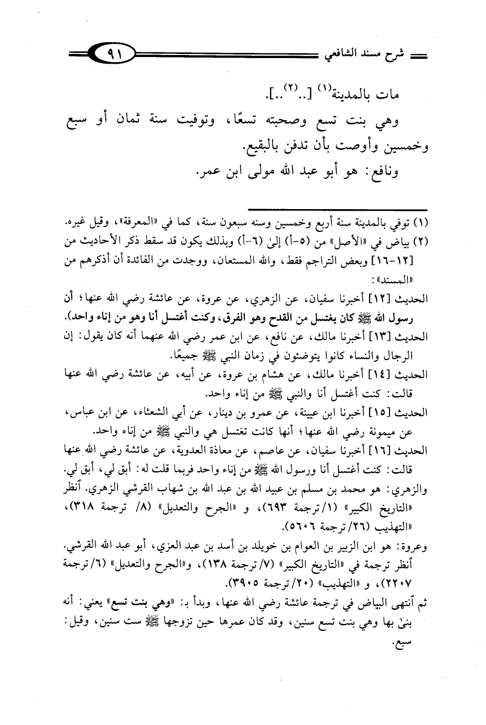ثم انتهى البياض في ترجمة عائشة رضي الله عنها، وبدأ بـ: "وهي بنت تسع" يعني: أنه بنى بها وهي بنت تسع سنين، وقد كان عمرها حين تزوجها - صلى الله عليه وسلم - ست سنين، وقيل: سبع.