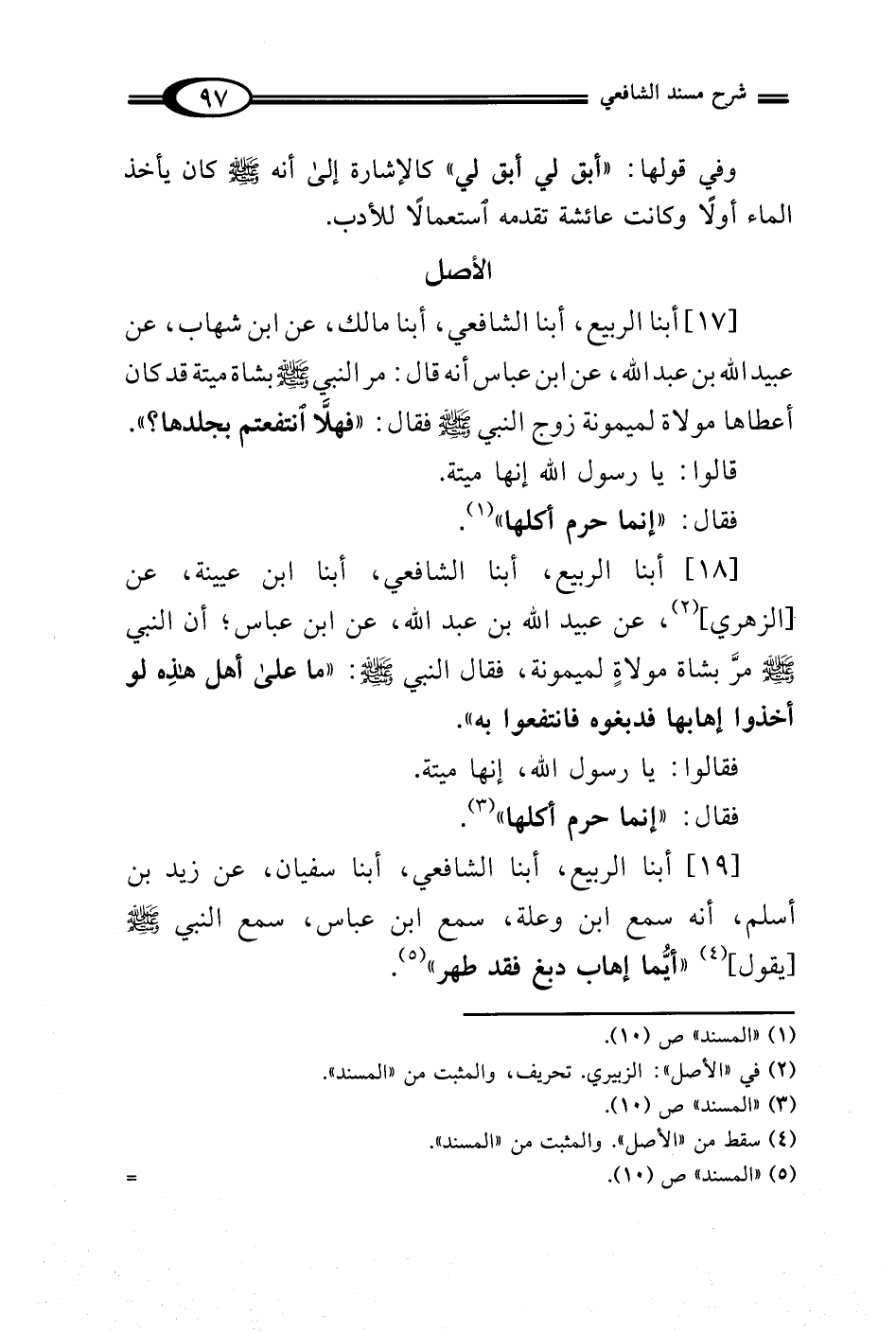 [17] أبنا الربيع، أبنا الشافعي، أبنا مالك، عن ابن شهاب، عن عبيد الله بن عبد الله، عن ابن عباس أنه قال: مر النبي - صلى الله عليه وسلم - بشاة ميتة قد كان أعطاها مولاة لميمونة زوج النبي - صلى الله عليه وسلم - فقال: "فهلَّا انتفعتم بجلدها؟ ".