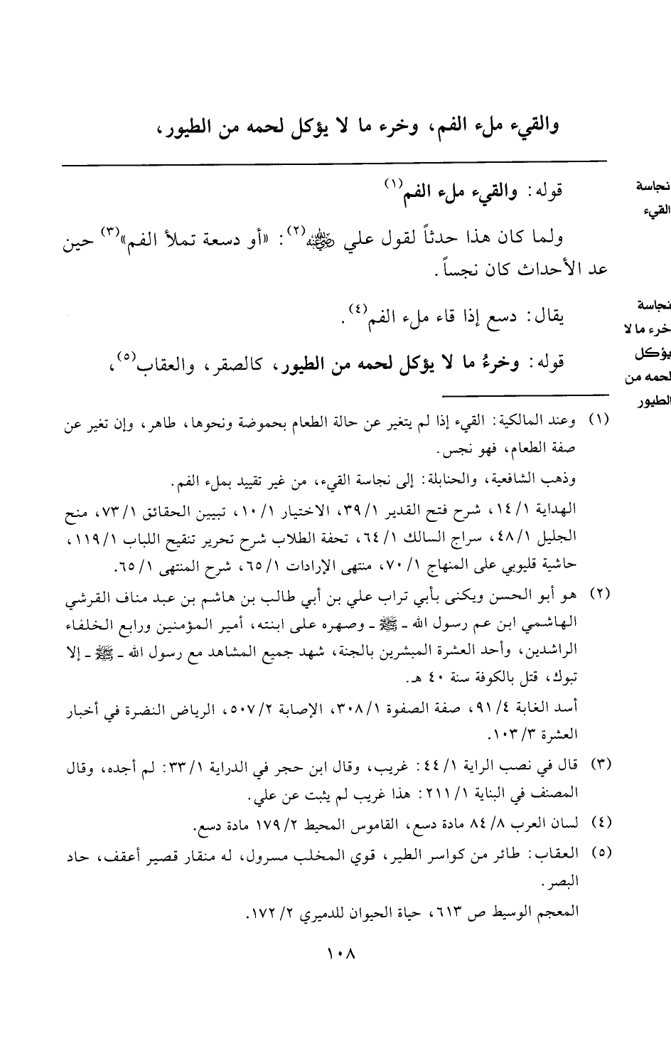 والقيء ملء الفم، وخرء ما لا يؤكل لحمه من الطيور،