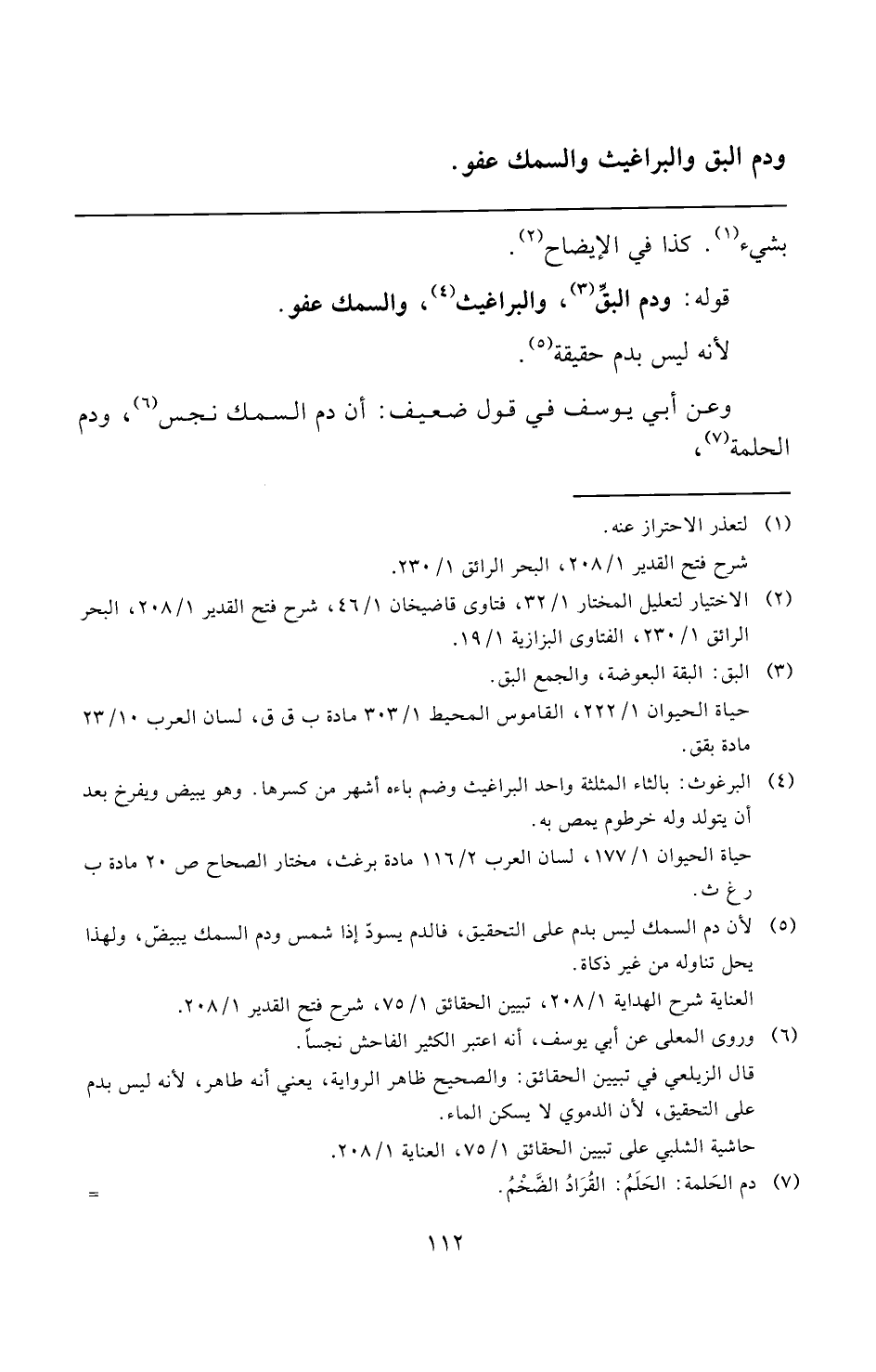 (¬٥) لأن دم السمك ليس بدم على التحقيق، فالدم يسودّ إذا شمس ودم السمك يبيضّ، ولهذا يحل تناوله من غير ذكاة.