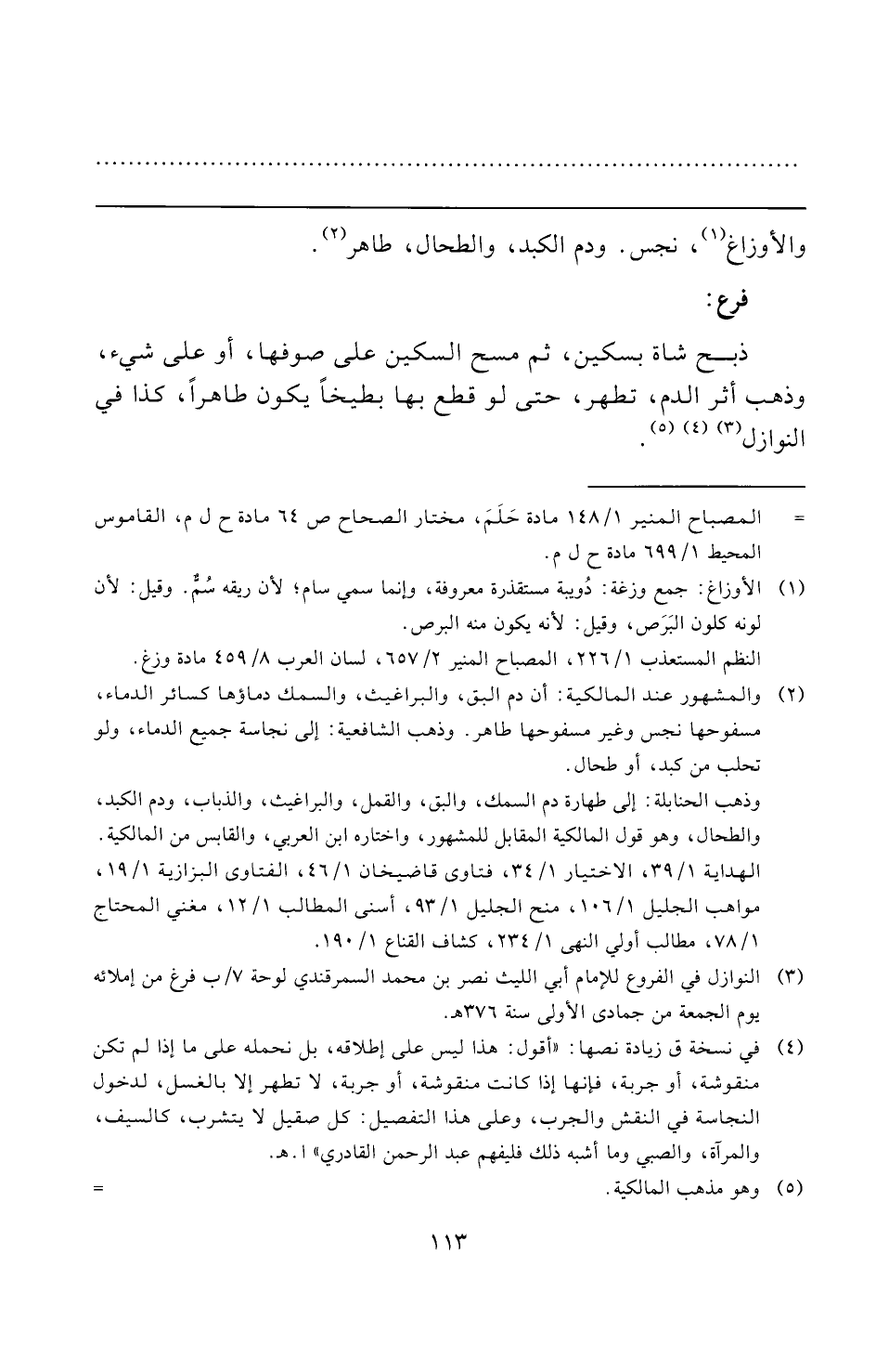 (¬٢) والمشهور عند المالكية: أن دم البق، والبراغيث، والسمك دماؤها كسائر الدماء، مسفوحها نجس وغير مسفوحها طاهر. وذهب الشافعية: إلى نجاسة جميع الدماء، ولو تحلب من كبد، أو طحال.