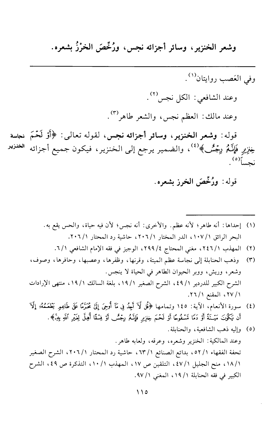 قوله: وشعر الخنزير، وسائر أجزائه نجس، لقوله تعالى: {أَوْ لَحْمَ خِنْزِيرٍ فَإِنَّهُ رِجْسٌ} (¬٤)، والضمير يرجع إلى الخنزير، فيكون جميع أجزائه نجسًا (¬٥).