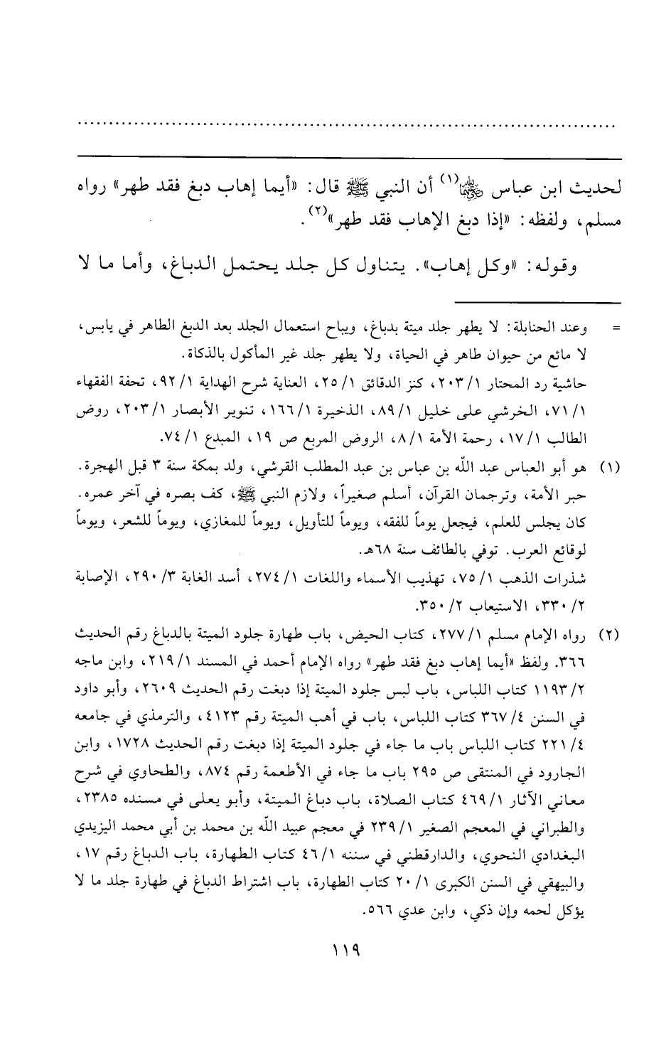 (¬٢) رواه الإمام مسلم ١/ ٢٧٧، كتاب الحيض، باب طهارة جلود الميتة بالدباغ رقم الحديث ٣٦٦. ولفظ "أيما إهاب دبغ فقد طهر" رواه الإمام أحمد في المسند ١/ ٢١٩، وابن ماجه ٢/ ١١٩٣ كتاب اللباس، باب لبس جلود الميتة إذا دبغت رقم الحديث ٢٦٠٩، وأبو داود في السنن ٤/ ٣٦٧ كتاب اللباس، باب في أهب الميتة رقم ٤١٢٣، والترمذي في جامعه ٤/ ٢٢١ كتاب اللباس باب ما جاء في جلود الميتة إذا دبغت رقم الحديث ١٧٢٨، وابن الجارود في المنتقى ص ٢٩٥ باب ما جاء في الأطعمة رقم ٨٧٤، والطحاوي في شرح معاني الآثار ١/ ٤٦٩ كتاب الصلاة، باب دباغ الميتة، وأبو يعلى في مسنده ٢٣٨٥، والطبراني في المعجم الصغير ١/ ٢٣٩ في معجم عبيد الله بن محمد بن أبي محمد اليزيدي البغدادي النحوي، والدارقطني في سننه ١/ ٤٦ كتاب الطهارة، باب الدباغ رقم ١٧، والبيهقي في السنن الكبرى ١/ ٢٠ كتاب الطهارة، باب اشتراط الدباغ في طهارة جلد ما لا يؤكل لحمه وإن ذكي، وابن عدي ٥٦٦.