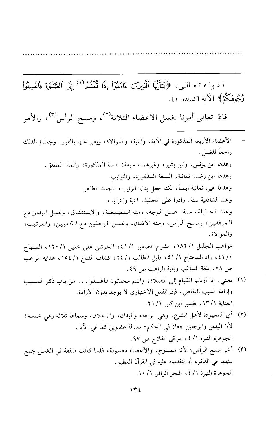 (¬٢) أي المعهودة لأهل الشرع. وهي الوجه، واليدان، والرجلان، وسماها ثلاثة وهي خمسة؛ لأن اليدين والرجلين جعلا في الحكم؛ بمنزلة عضوين كما في الآية.