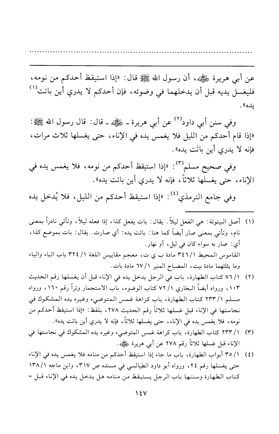 (¬٣) ١/ ٢٣٣ كتاب الطهارة، باب كراهة غمس المتوضيء وغيره يده المشكوك في نجاستها في الإناء قبل غسلها ثلاثًا رقم ٢٧٨ عن أبي هريرة -رضي الله عنه-.