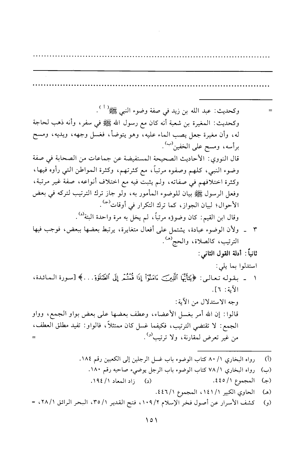 قال النووي: الأحاديث الصحيحة المستفيضة عن جماعات من الصحابة في صفة وضوء النبي، كلهم وصفوه مرتبًا، مع كثرتهم، وكثرة المواطن التي رأوه فيها، وكثرة اختلافهم في صفاته، ولم يثبت فيه مع اختلاف أنواعه، صفة غير مرتبة، وفعل الرسول -صلى الله عليه وسلم- بيان للوضوء المأمور به، ولو جاز ترك الترتيب لتركه في بعض الأحوال؛ لبيان الجواز، كما ترك التكرار في أوقات (جـ).
