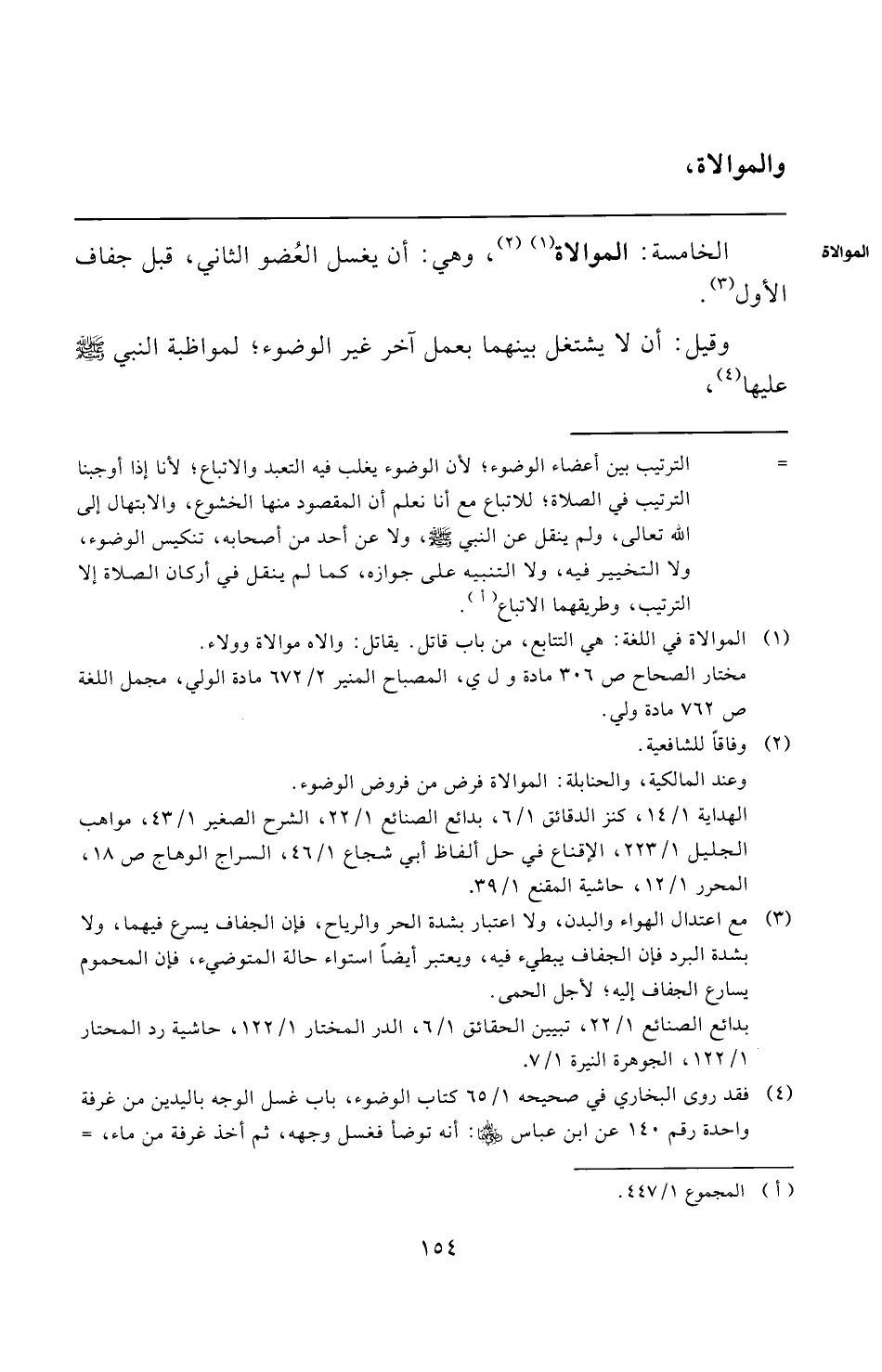 الخامسة: الموالاة (¬١) (¬٢)، وهي: أن يغسل العُضو الثاني، قبل جفاف الأول (¬٣).