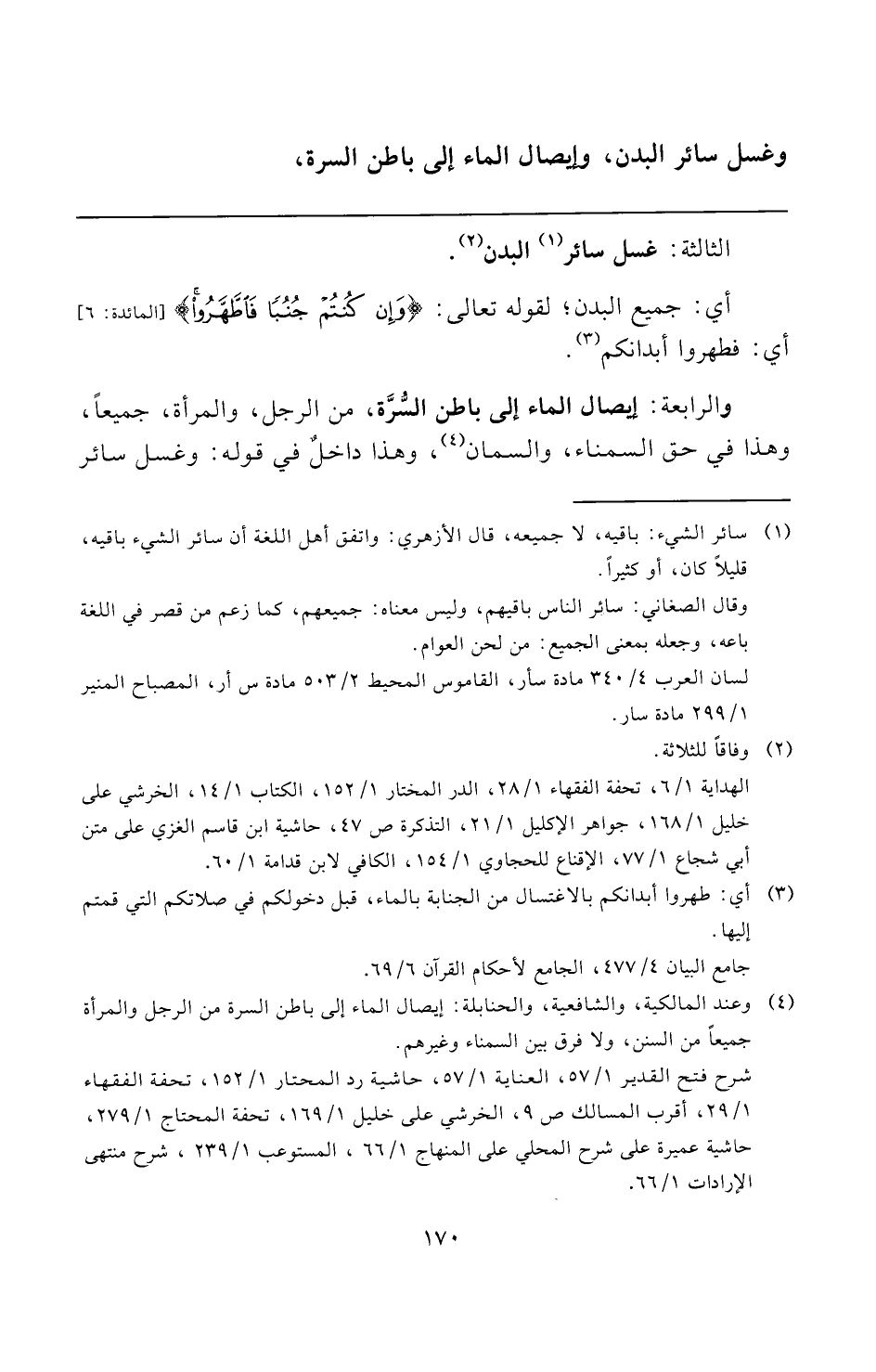 والرابعة: إيصال الماء إلى باطن السُّرَّة، من الرجل، والمرأة، جميعًا، وهذا في حق السمناء، والسمان (¬٤)، وهذا داخلٌ في قوله: وغسل سائر