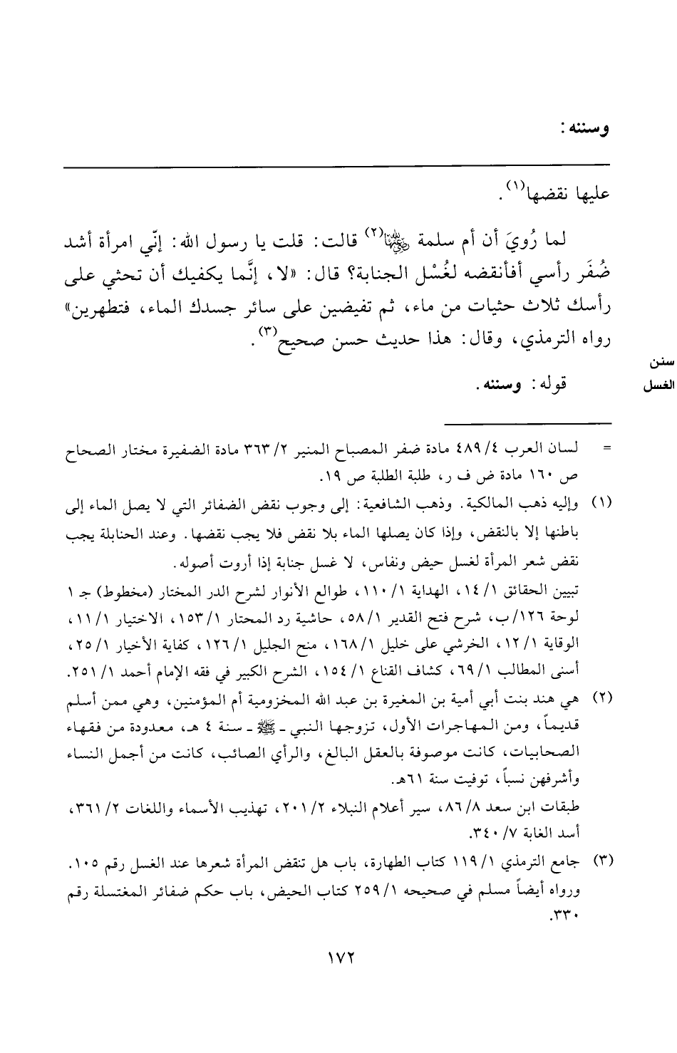 (¬٣) جامع الترمذي ١/ ١١٩ كتاب الطهارة، باب هل تنقض المرأة شعرها عند الغسل رقم ١٠٥.
