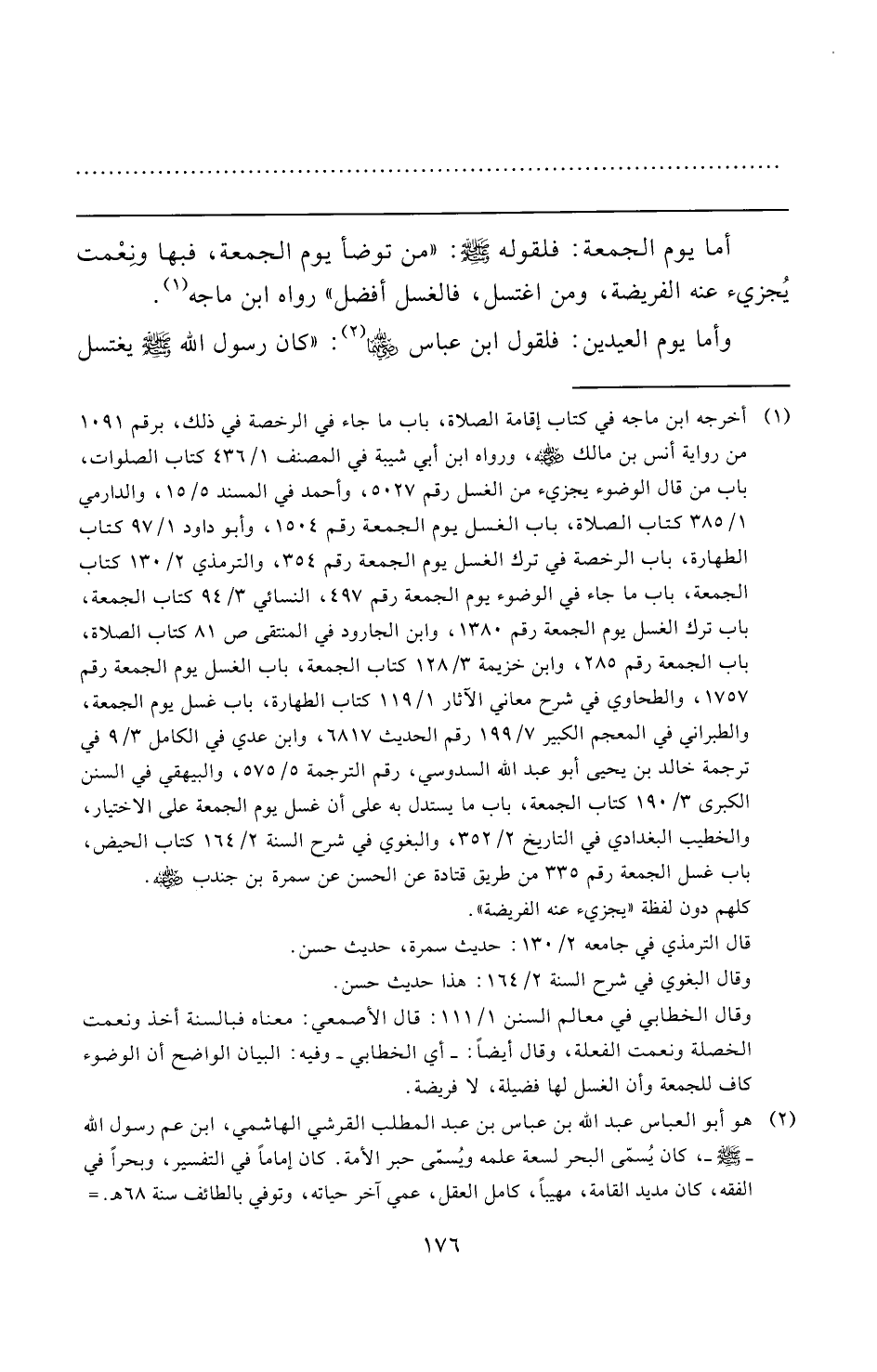 (¬١) أخرجه ابن ماجه في كتاب إقامة الصلاة، باب ما جاء في الرخصة في ذلك، برقم ١٠٩١ من رواية أنس بن مالك -رضي الله عنه-، ورواه ابن أبي شيبة في المصنف ١/ ٤٣٦ كتاب الصلوات، باب من قال الوضوء يجزيء من الغسل رقم ٥٠٢٧، وأحمد في المسند ٥/ ١٥، والدارمي ١/ ٣٨٥ كتاب الصلاة، باب الغسل يوم الجمعة رقم ١٥٠٤، وأبو داود ١/ ٩٧ كتاب الطهارة، باب الرخصة في ترك الغسل يوم الجمعة رقم ٣٥٤، والترمذي ٢/ ١٣٠ كتاب الجمعة، باب ما جاء في الوضوء يوم الجمعة رقم ٤٩٧، النسائي ٣/ ٩٤ كتاب الجمعة، باب ترك الغسل يوم الجمعة رقم ١٣٨٠، وابن الجارود في المنتقى ص ٨١ كتاب الصلاة، باب الجمعة رقم ٢٨٥، وابن خزيمة ٣/ ١٢٨ كتاب الجمعة، باب الغسل يوم الجمعة رقم ١٧٥٧، والطحاوي في شرح معاني الآثار ١/ ١١٩ كتاب الطهارة، باب غسل يوم الجمعة، والطبراني في المعجم الكبير ٧/ ١٩٩ رقم الحديث ٦٨١٧، وابن عدي في الكامل ٣/ ٩ في ترجمة خالد بن يحيى أبو عبد الله السدوسي، رقم الترجمة ٥/ ٥٧٥، والبيهقي في السنن الكبرى ٣/ ١٩٠ كتاب الجمعة، باب ما يستدل به على أن غسل يوم الجمعة على الاختيار، والخطيب البغدادي في التاريخ ٢/ ٣٥٢، والبغوي في شرح السنة ٢/ ١٦٤ كتاب الحيض، باب غسل الجمعة رقم ٣٣٥ من طريق قتادة عن الحسن عن سمرة بن جندب -رضي الله عنه-.