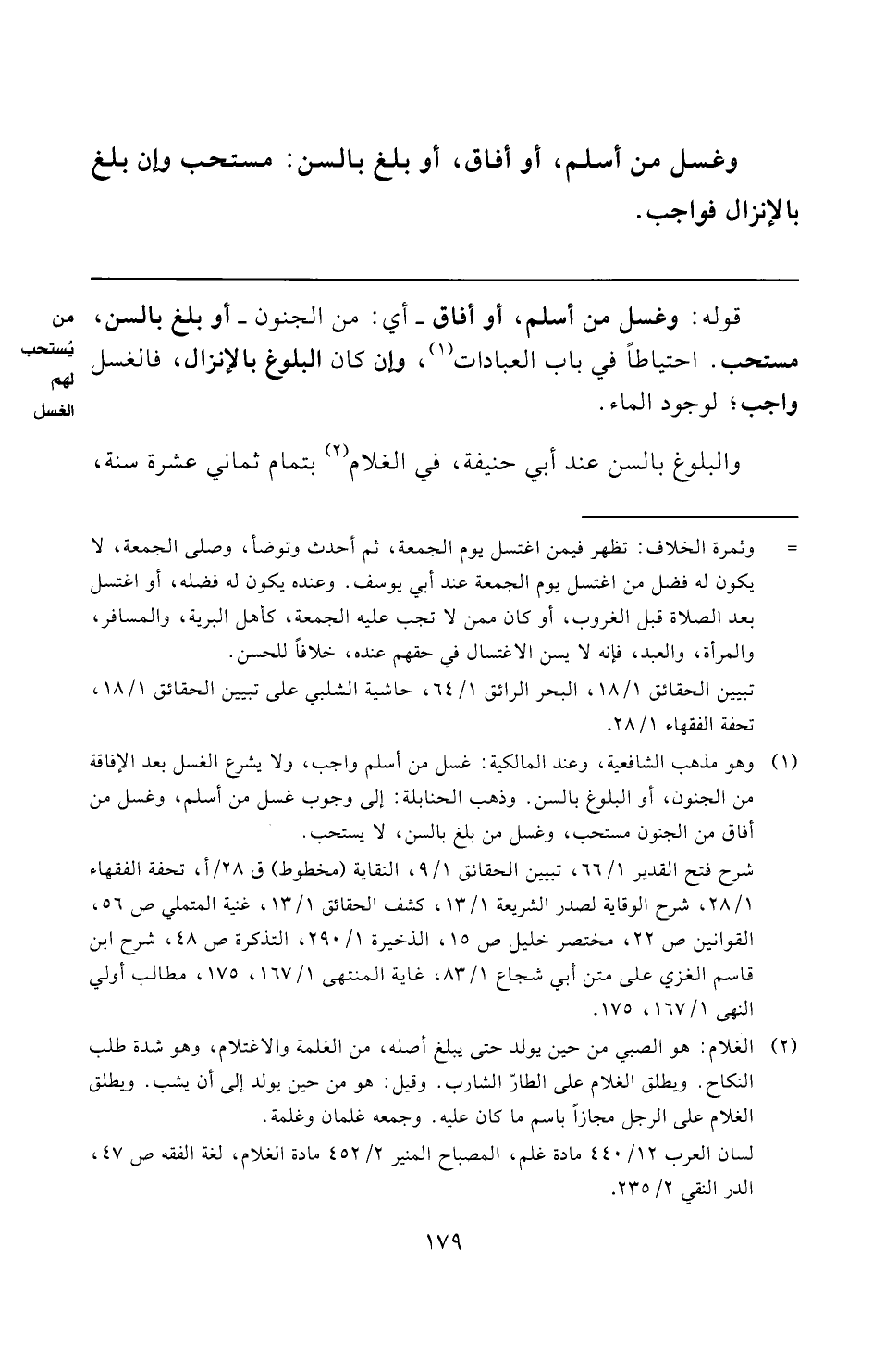 (¬١) وهو مذهب الشافعية، وعند المالكية: غسل من أسلم واجب، ولا يشرع الغسل بعد الإفاقة من الجنون، أو البلوغ بالسن. وذهب الحنابلة: إلى وجوب غسل من أسلم، وغسل من أفاق من الجنون مستحب، وغسل من بلغ بالسن، لا يستحب.