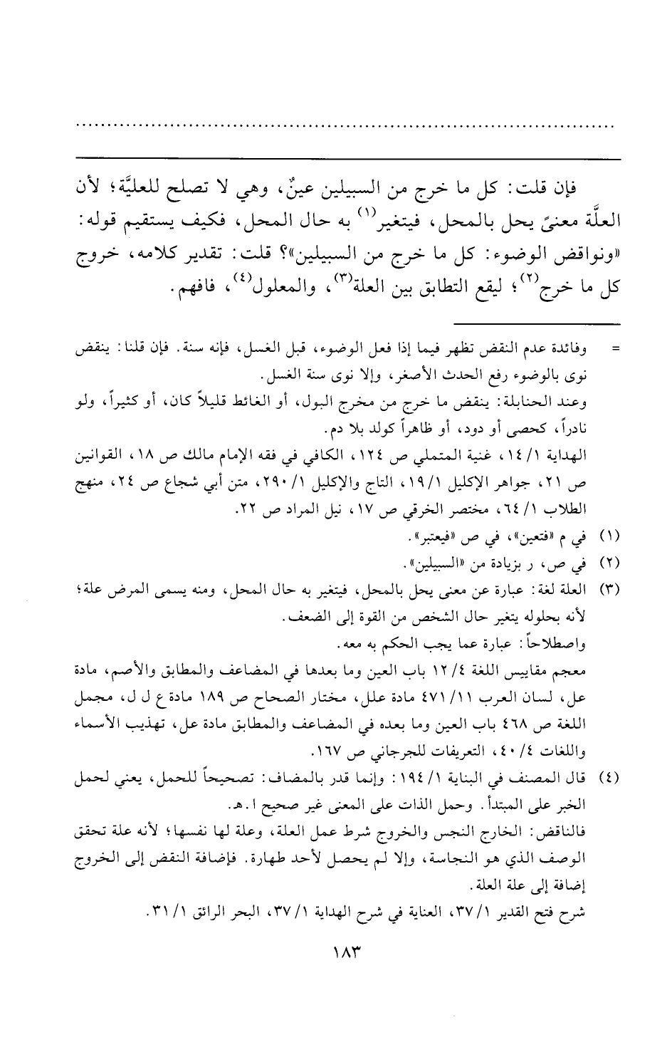 فإن قلت: كل ما خرج من السبيلين عينٌ، وهي لا تصلح للعليَّة؛ لأن العلَّة معنىً يحل بالمحل، فيتغير (¬١) به حال المحل، فكيف يستقيم قوله: "ونواقض الوضوء: كل ما خرج من السبيلين"؟ قلت: تقدير كلامه، خروج كل ما خرج (¬٢)؛ ليقع التطابق بين العلة (¬٣)، والمعلول (¬٤)، فافهم.