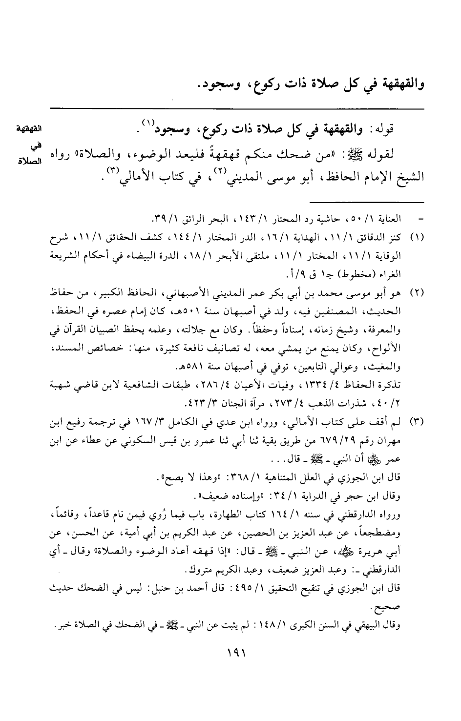 لقوله -صلى الله عليه وسلم-: "من ضحك منكم قهقهةً فليعد الوضوء، والصلاة" رواه الشيخ الإمام الحافظ، أبو موسى المديني (¬٢)، في كتاب الأمالي (¬٣).
